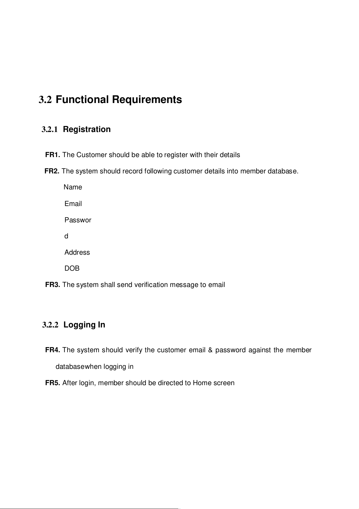 FR2. The system should record folowing customer details into member database. Name Email Passwor d Address DOB