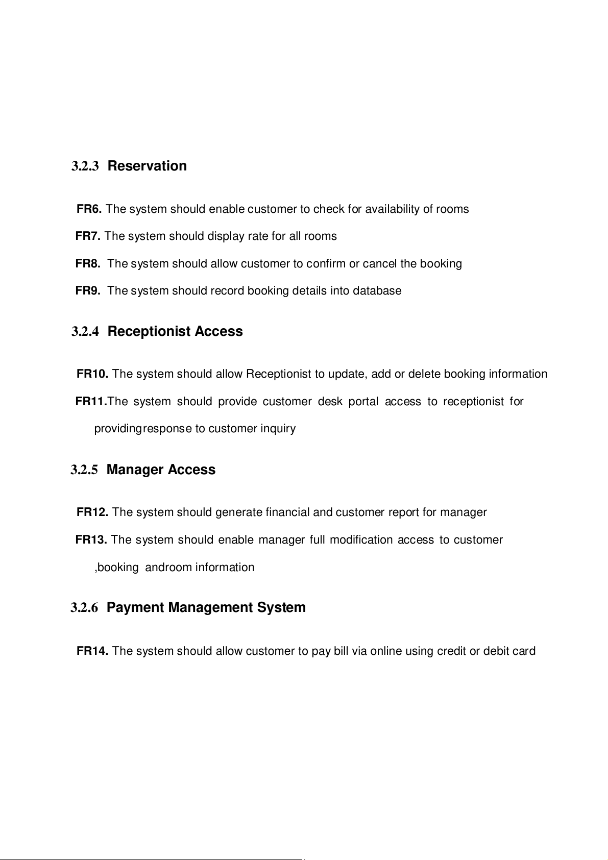 FR13. The system should enable manager ful modification access to customer ,booking and room information