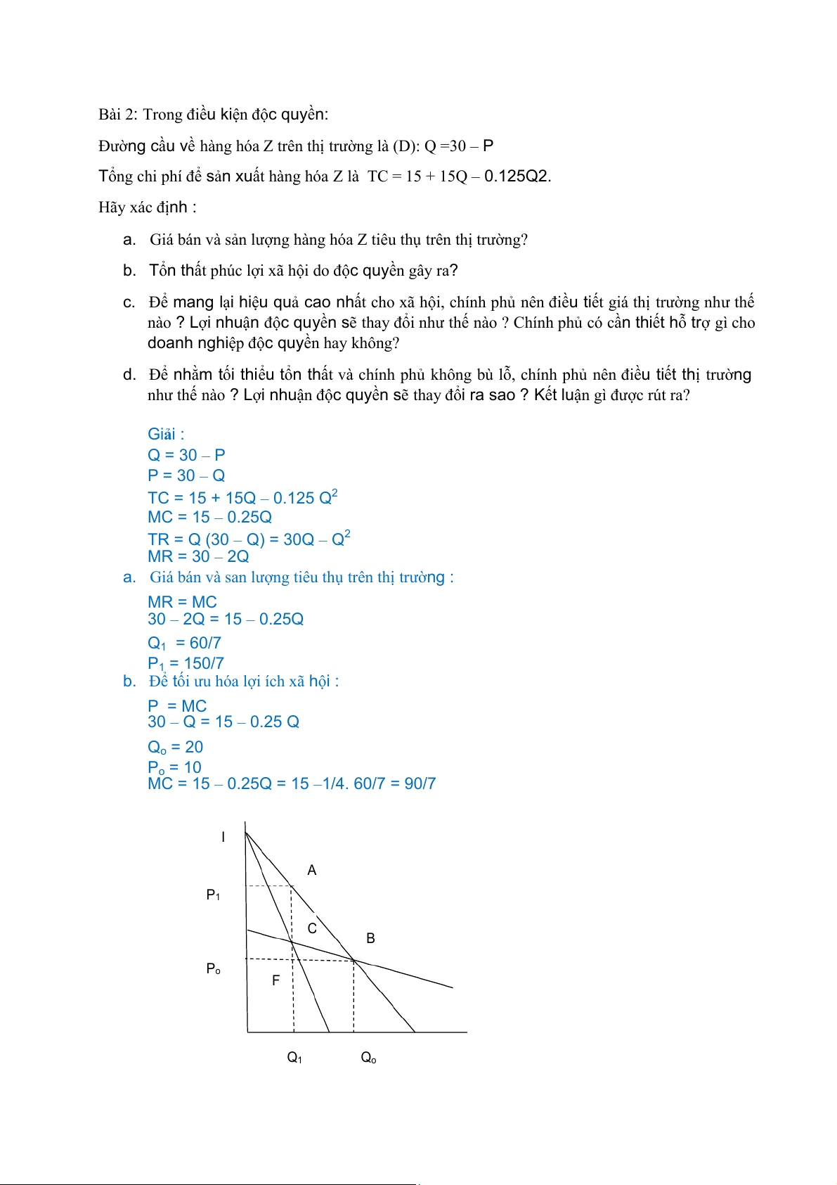Bài 1: Một doanh nghiệp độc quyền trong việc cung cấp một hàng hóa X. Tổng chi phí để sản