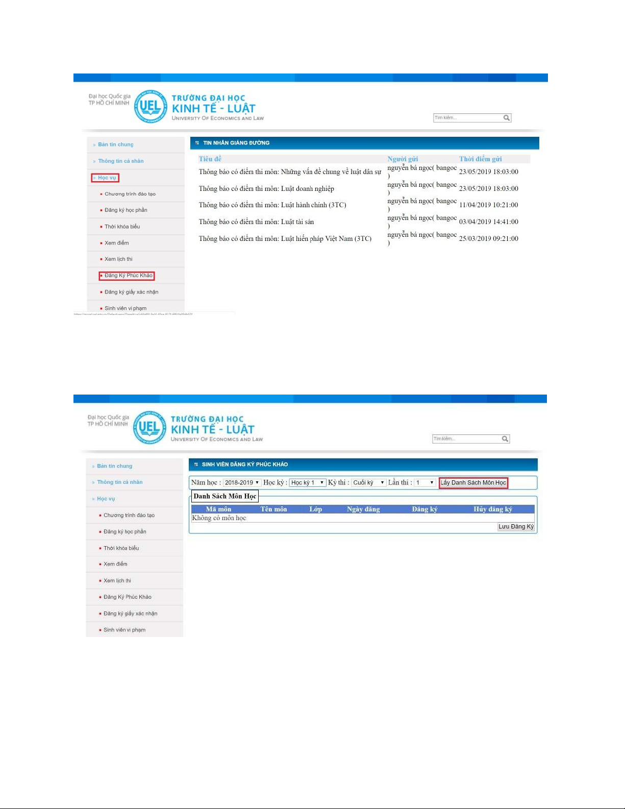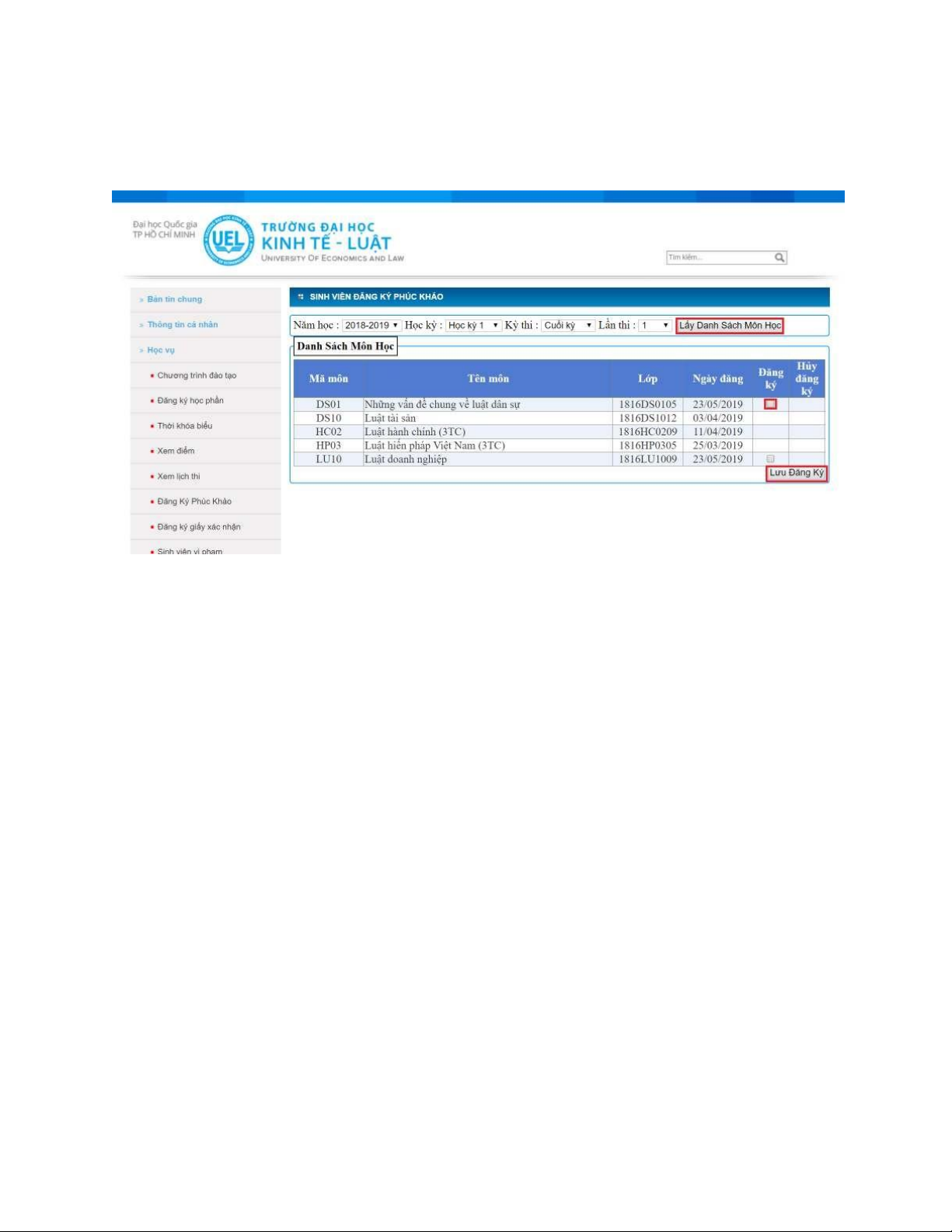 và đăng kí phúc khảo trực tiếp môn học của mình (trong thời hạn 05 ngày làm