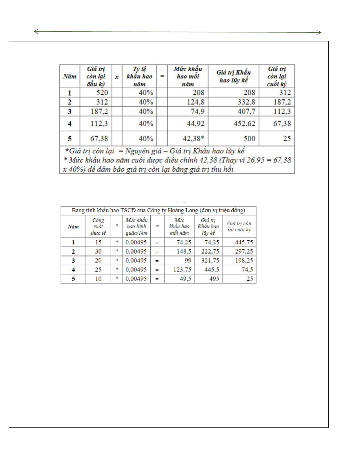 Khấu hao mỗi năm = 495/5 = 99 (Mỗi năm tỉ lệ khấu hao là 20%)
