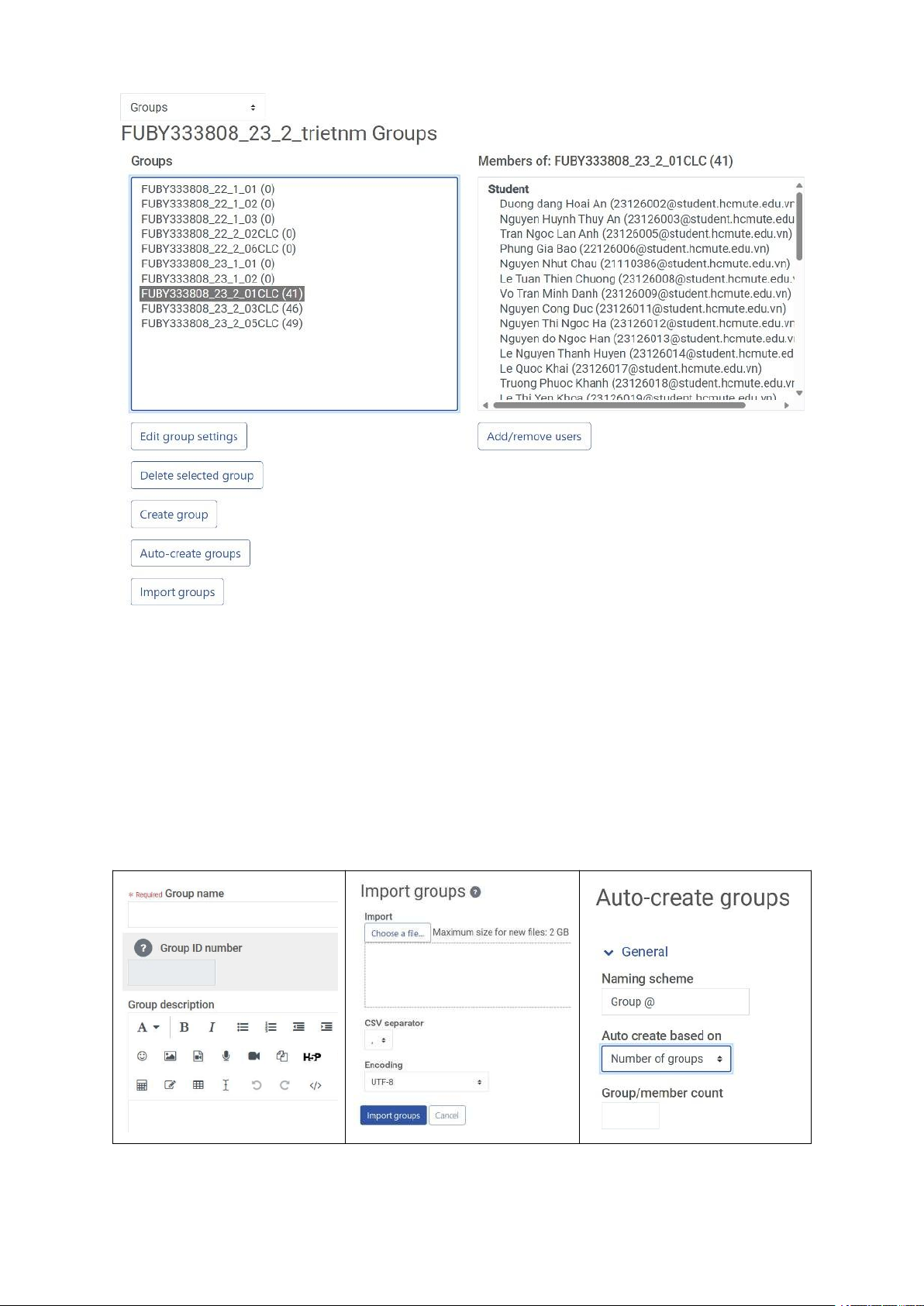 Hoặc có thể vừa thêm sinh viên vừa chia nhóm. Ví dụ Trang 10 # Tên Nhóm 1 23146100@student.hcmute.edu.vn 23146101@student.hcmute.edu.vn # Tên Nhóm 2 23146102@student.hcmute.edu.vn 23146103@student.hcmute.edu.vn