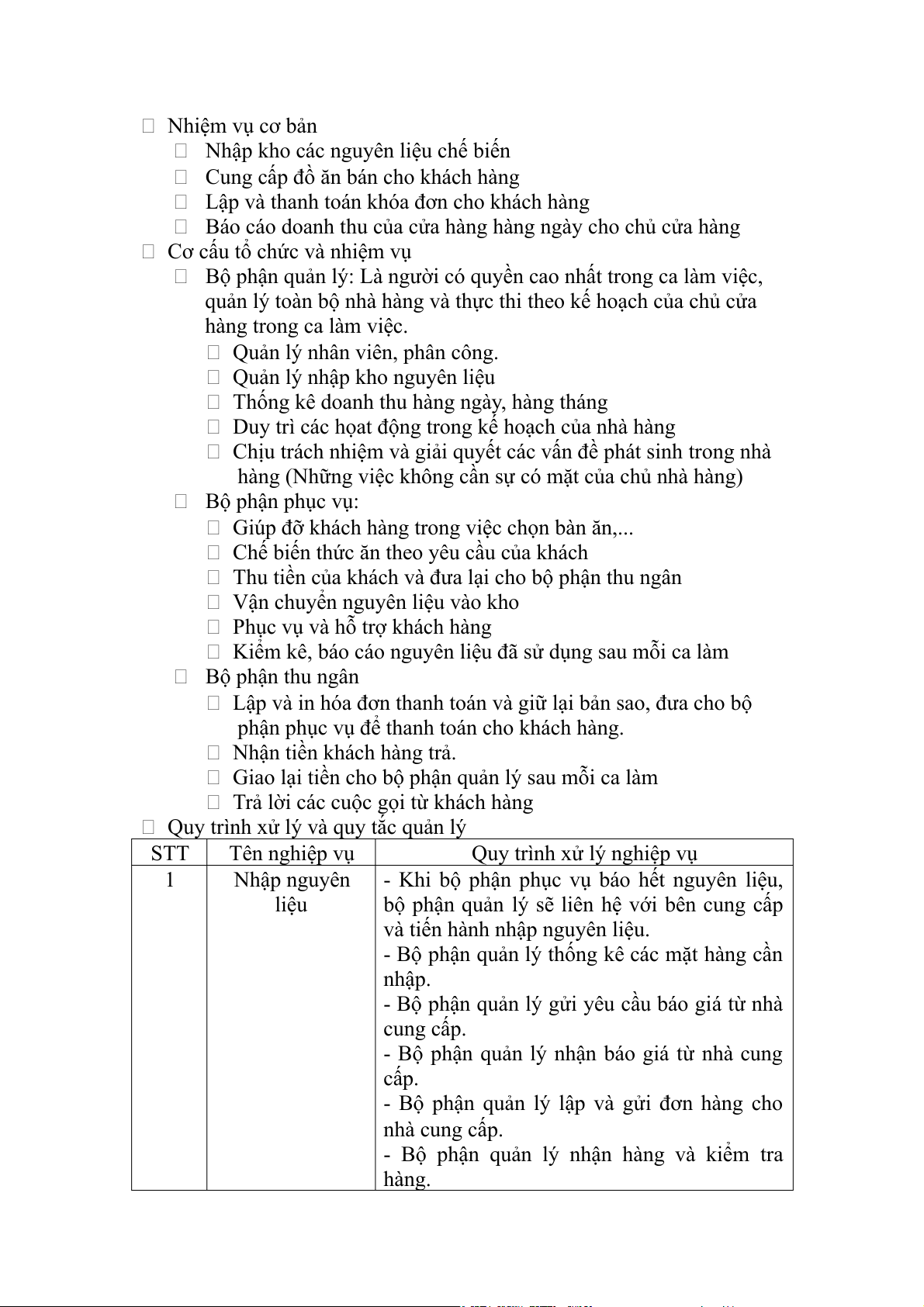 hàng (Những việc không cần sự có mặt của chủ nhà hàng) Bộ phận phục vụ:
