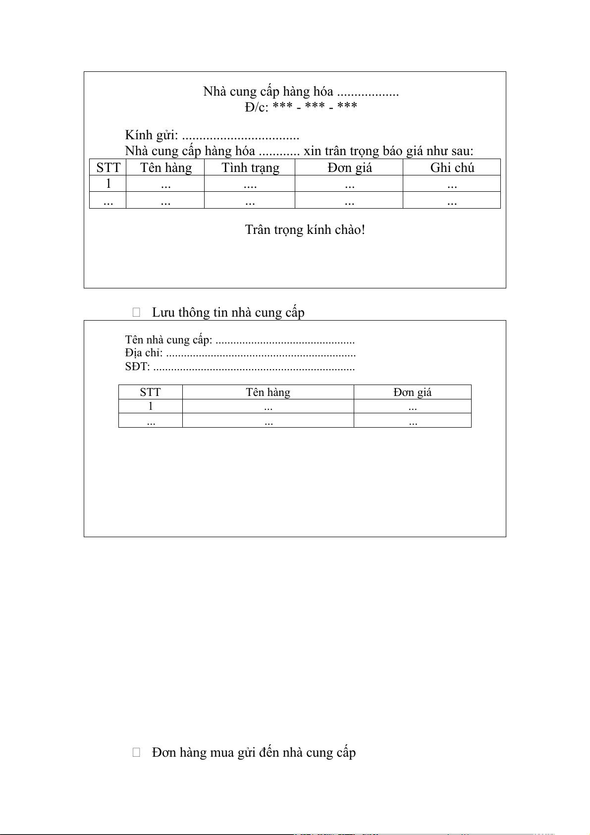 Nhà cung cấp hàng hóa ............ xin trân trọng báo giá như sau: STT Tên hàng Tình trạng Đơn giá Ghi chú 1 ... .... ... ... ... ... ... ... ... Trân trọng kính chào!