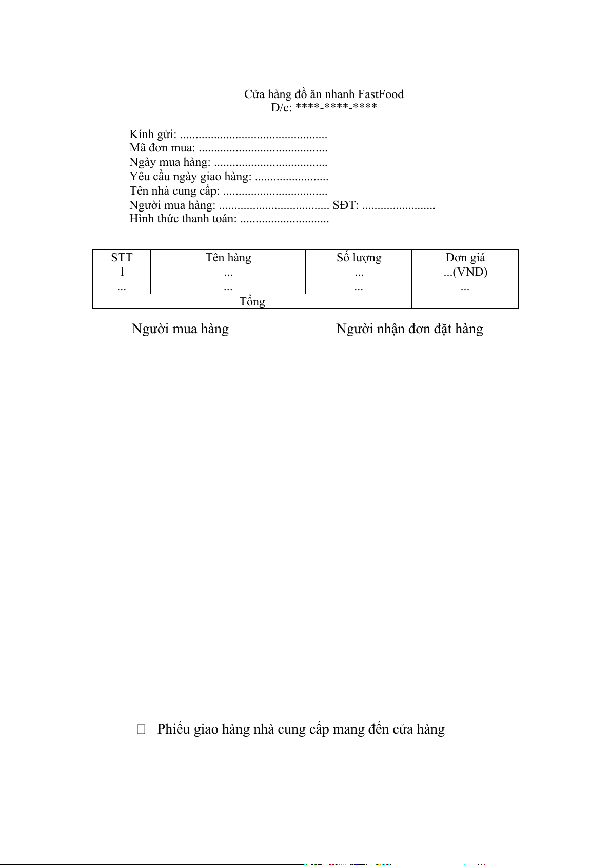 Cửa hàng đồ ăn nhanh FastFood Đ/c: *** - *** - *** Số: ................. Ngày... tháng ... năm ...