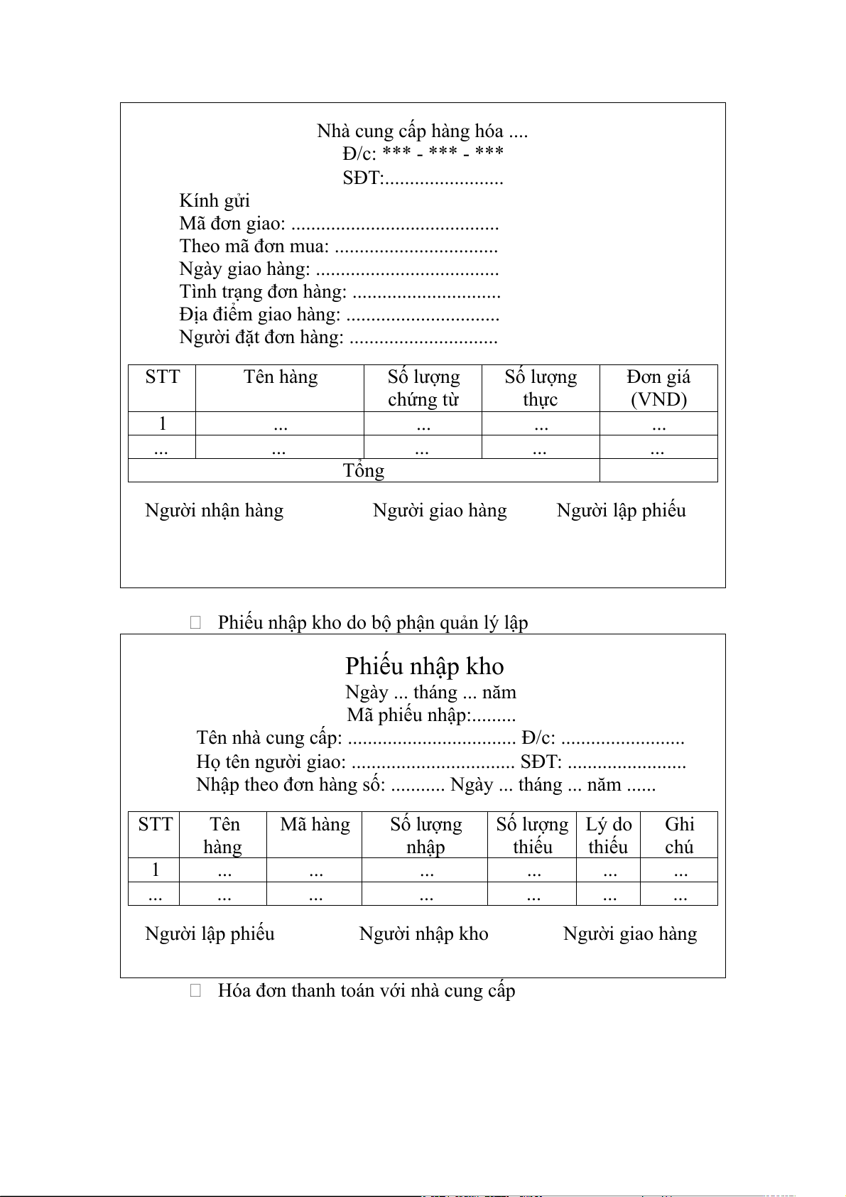 Tên nhà cung cấp: .................................. Đ/c: .........................