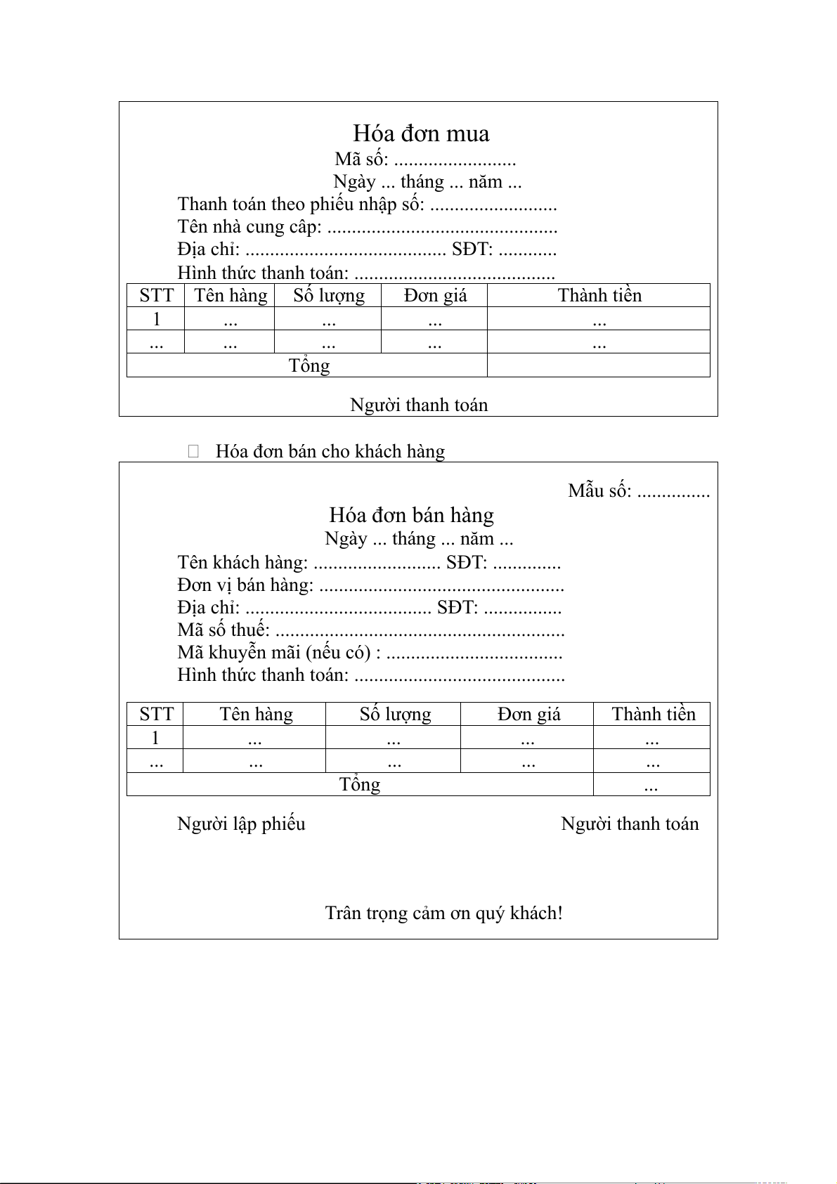 Hình thức thanh toán: ......................................... STT Tên hàng Số lượng Đơn giá Thành tiền 1 ... ... ... ... ... ... ... ... ... Tổng Người thanh toán