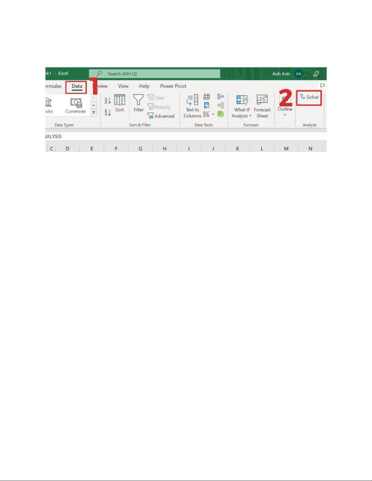 Bước 4: Solver xuất hiện trên thanh tab Data, nằm trong nhóm Analyze.