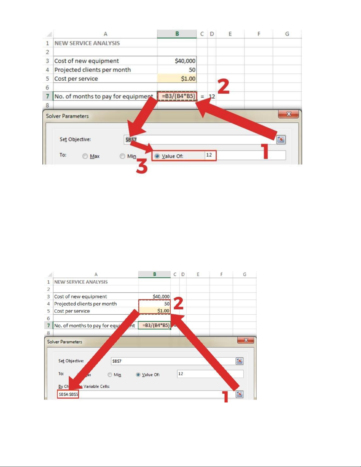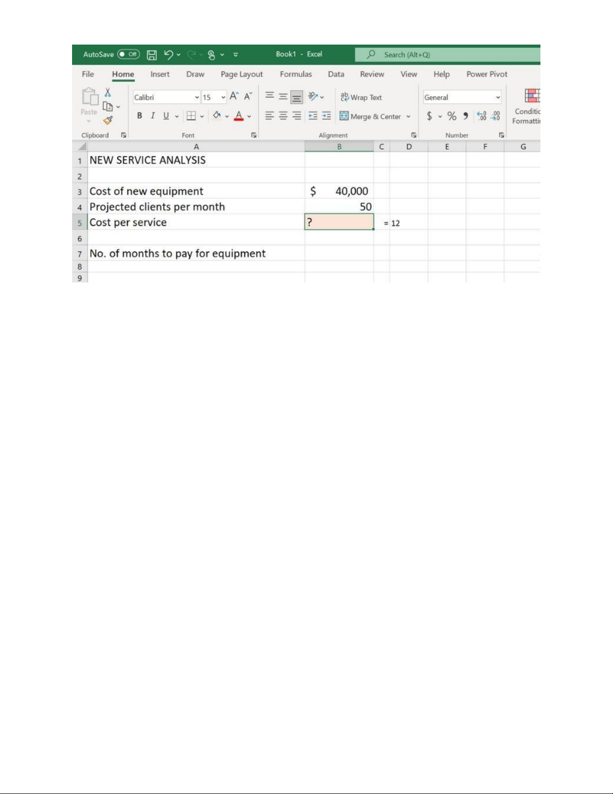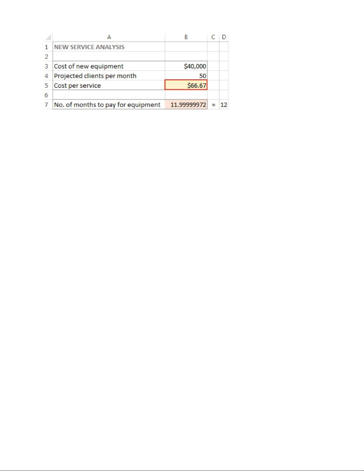 là B7, và nó biểu thị thời gian thanh toán được tính bằng công thức: =B3/(B4*B5), với kết quả của phương trình là 12. Xác