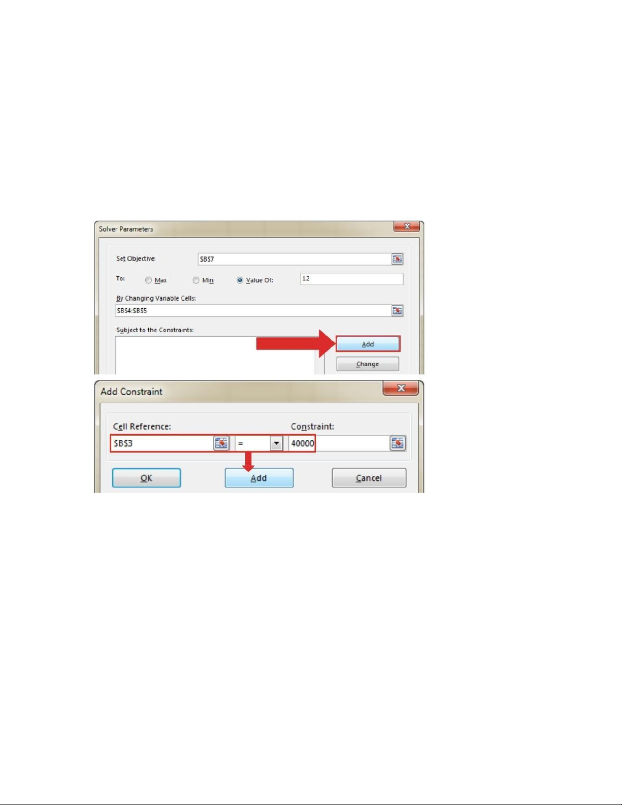 Bước 1: Nhấp vào Add ngay bên phải phần Subject to the Constraints.