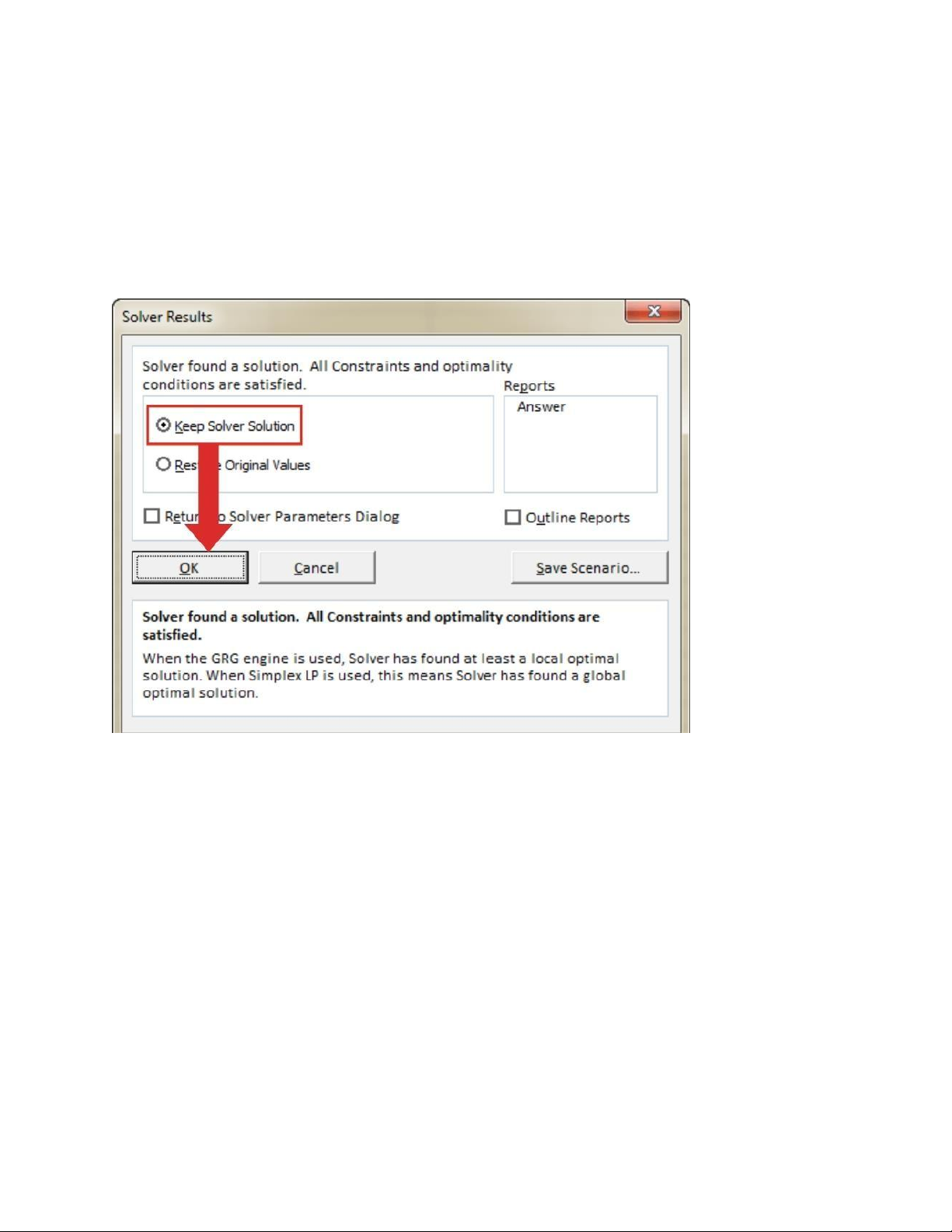 Solver đã tìm ra và sau đó nhấn nút OK để xác nhận quyết định của. Thiết lập lựa chọn khi giải quyết vấn đề