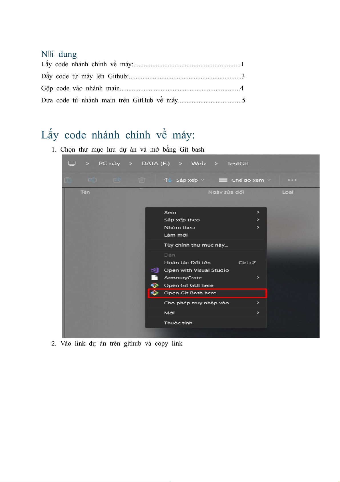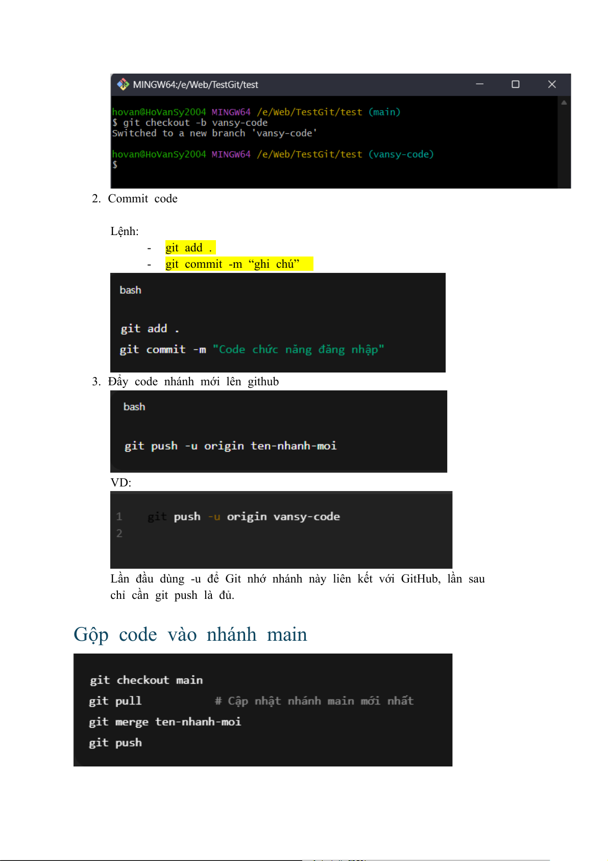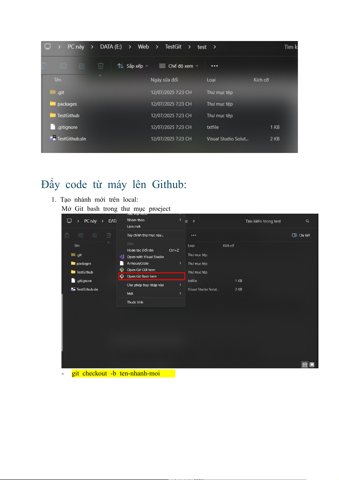 Mở Git bash trong thư mục proeject - git checkout -b ten-nhanh-moi 2. Commit code Lệnh: - git add . - git commit -m “ghi chú”