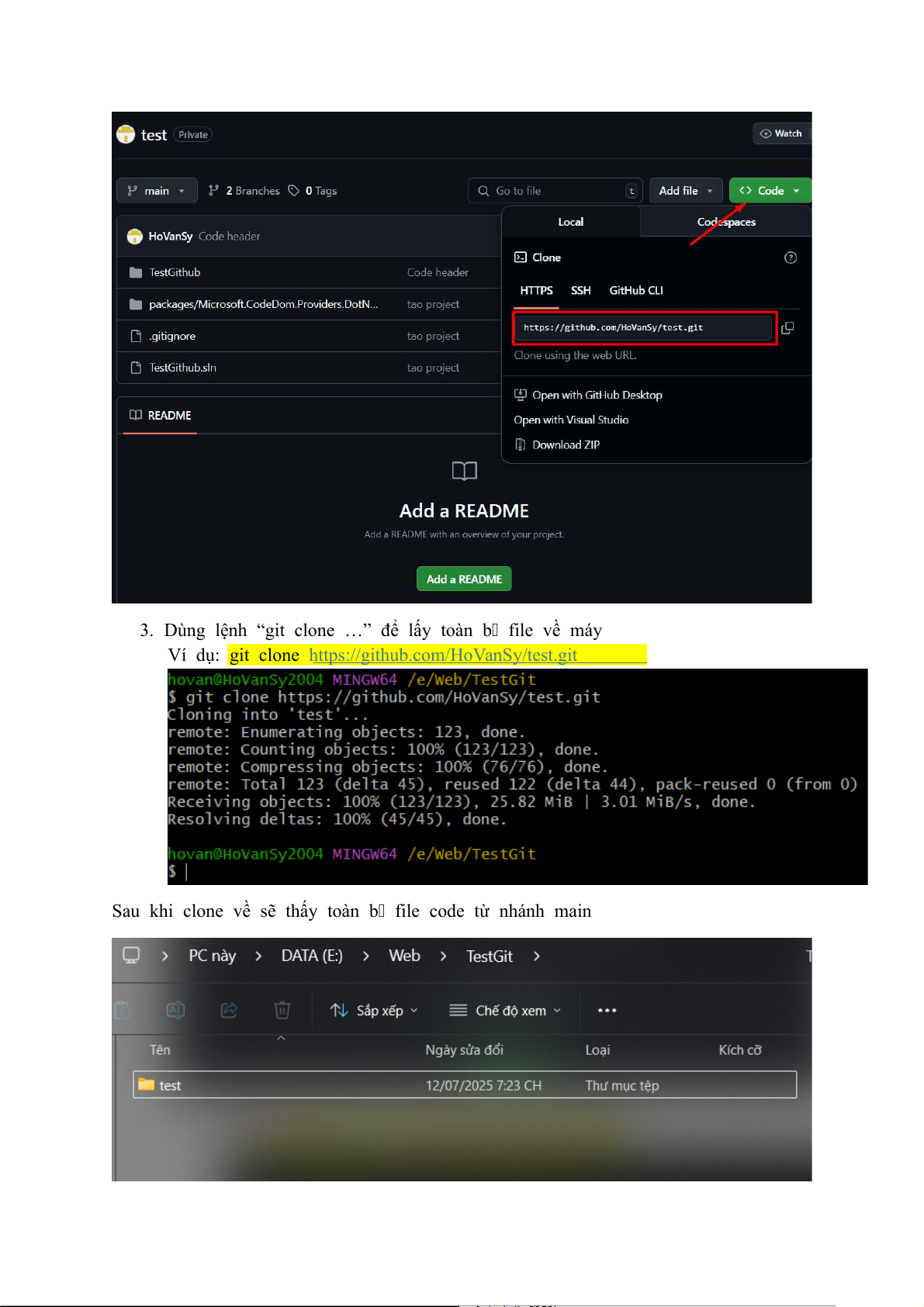 Ví dụ: git clone https://github.com/HoVanSy/test.git