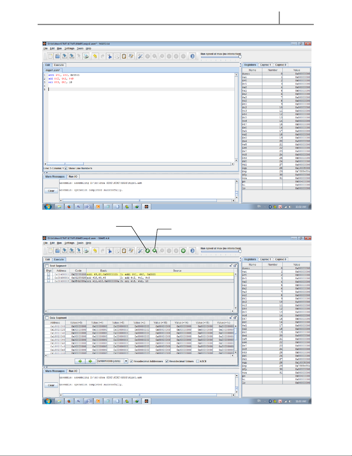 2. Bắt đầu lập trình assembly và chạy chương trình (run)