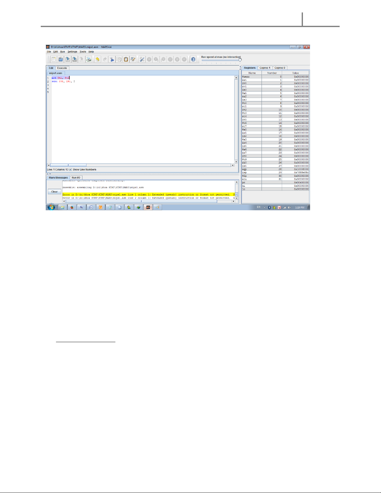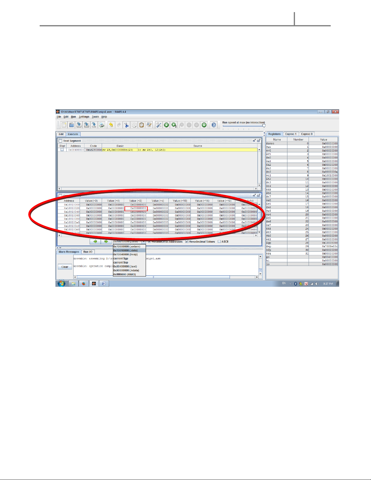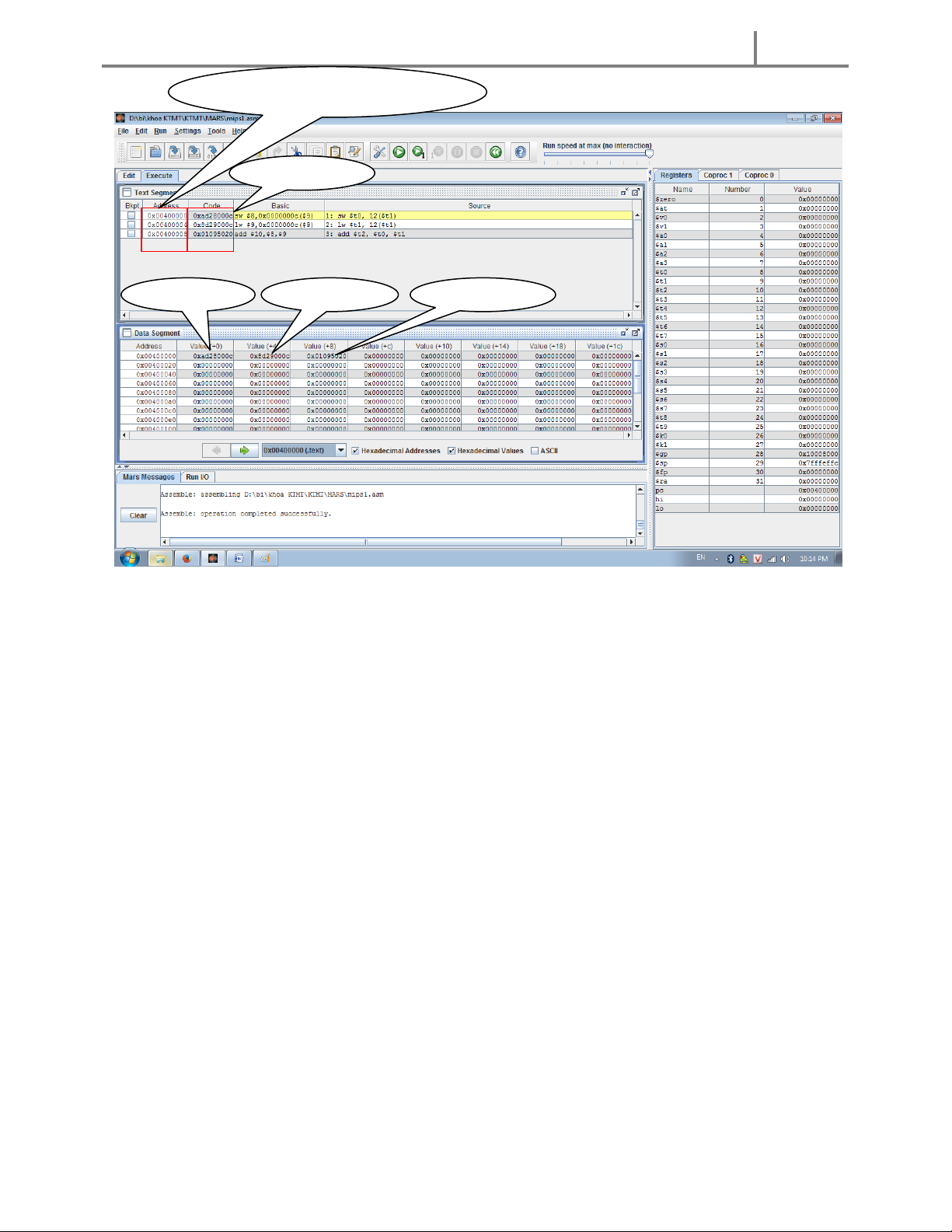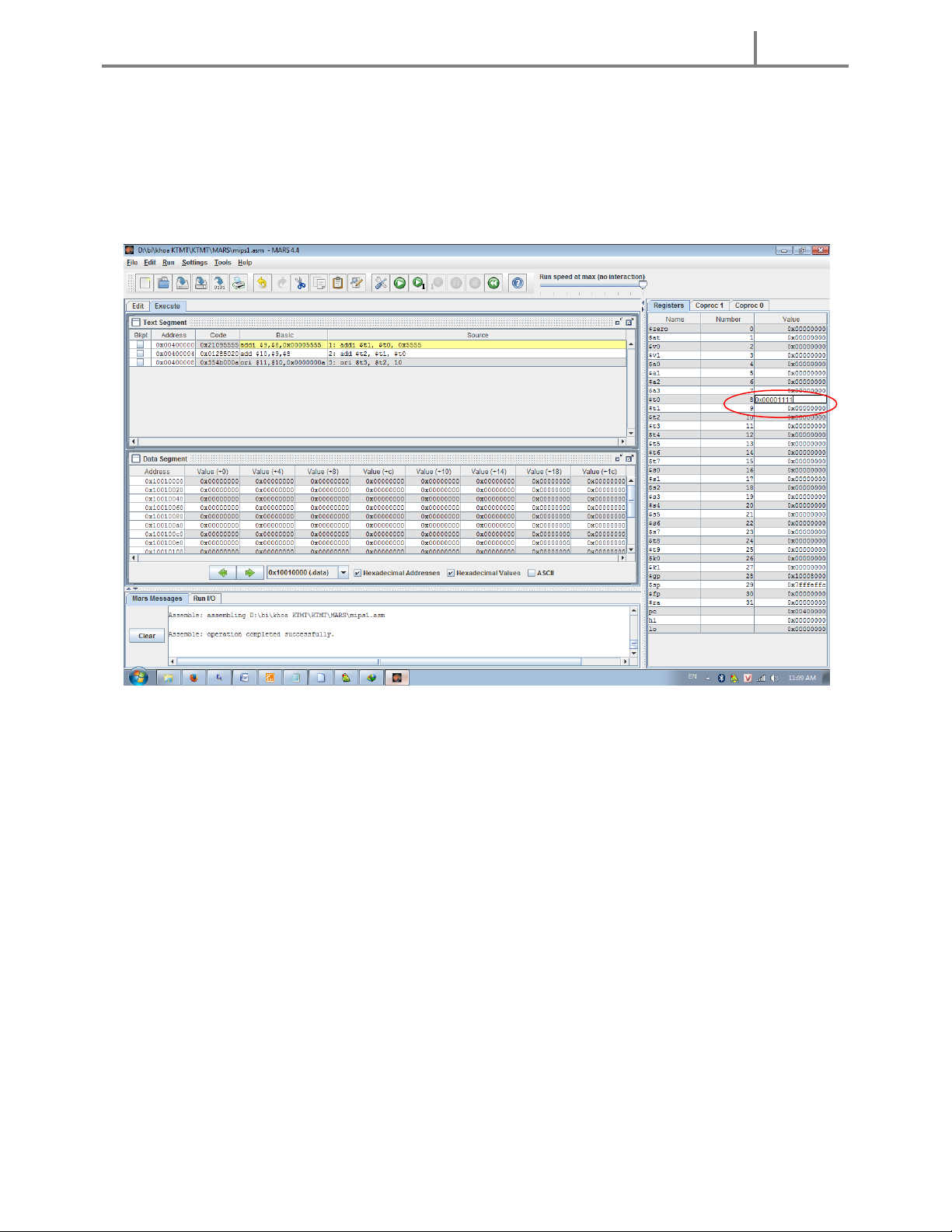 Gõ lệnh trên vào edit run Assemble chỉnh sửa giá trị thanh ghi $t1 = 0x10010000 và $t0 = 0x0000000a trước khi run