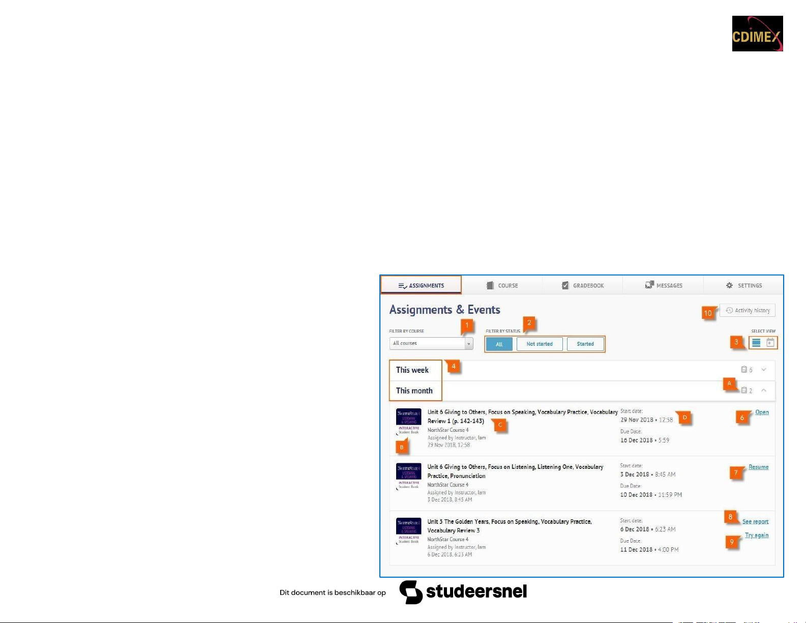 2. Filter by status: Lọc các bài tập theo trạng thái của chúng. Nhấp vào All để xem tất cả các hoạt động, nhấp vào Not started thấy