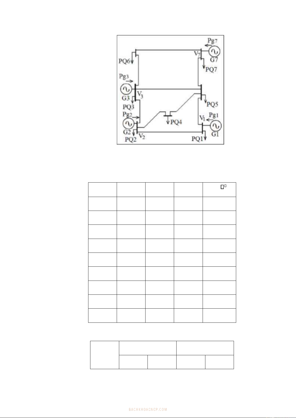 Bảng 1:Thông số các nhánh Bus Bus R(Ω) X(Ω) 0,5B( 1) 1 2 15 46 1,55E-04 1 5 12 38 1,26E-04 2 4 10 30 1,00E-04 2 3 13 39 1,31E-04 4 5 11 34 1,13E-0.4 3 5 16 48 1,60E-04 3 6 15 46 1,55E-04 6 7 17 50 1,72E-04 5 7 13 39 1,31E-04