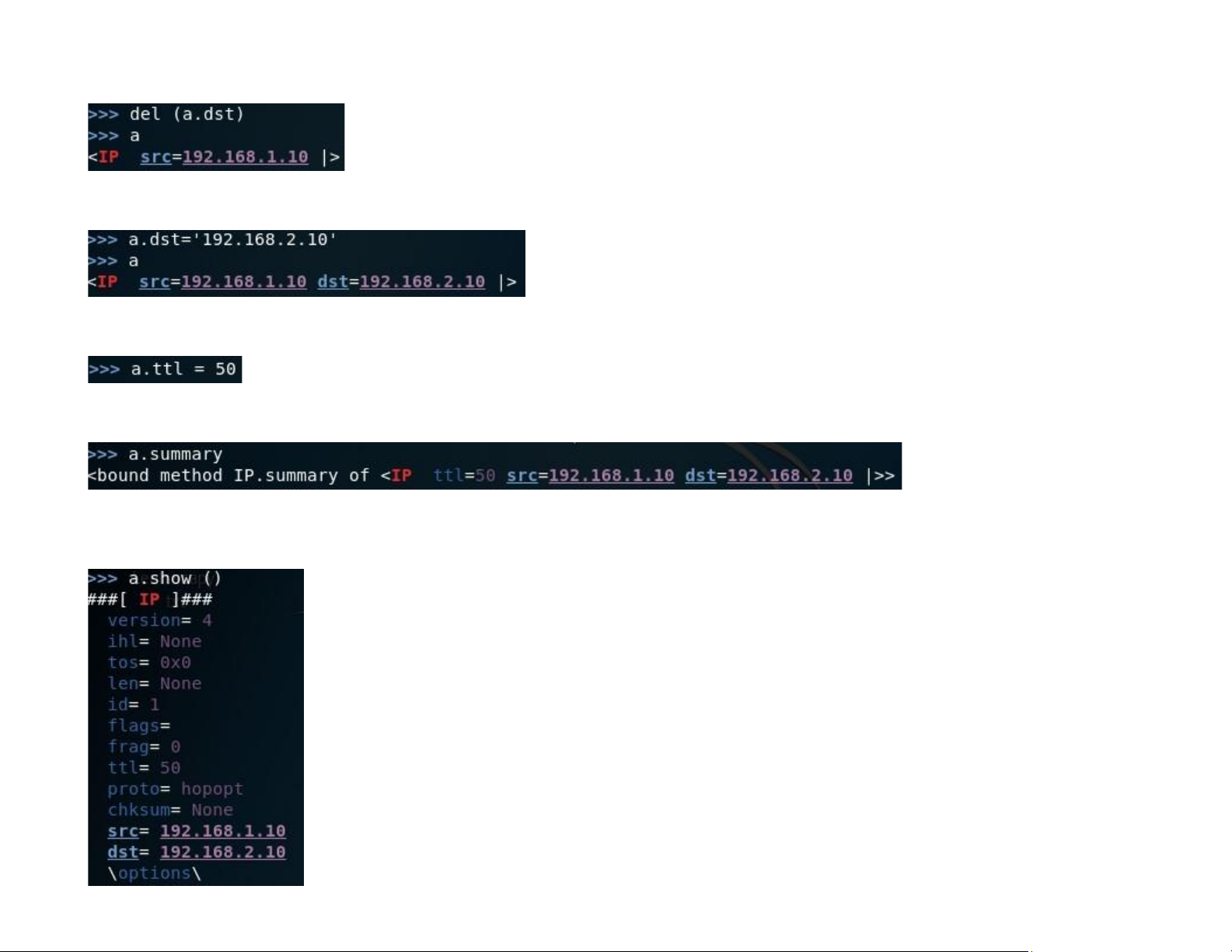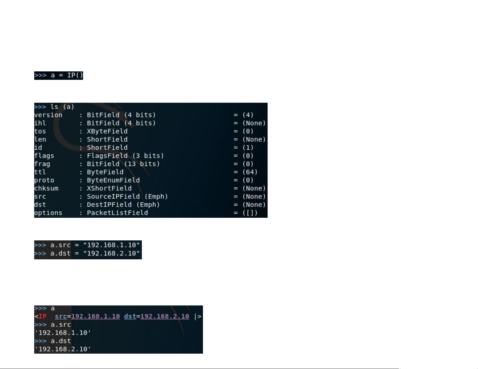 >>>a=IP(dst=“192.168.1.10”,src=“192.168.2.10”,ttl=50).