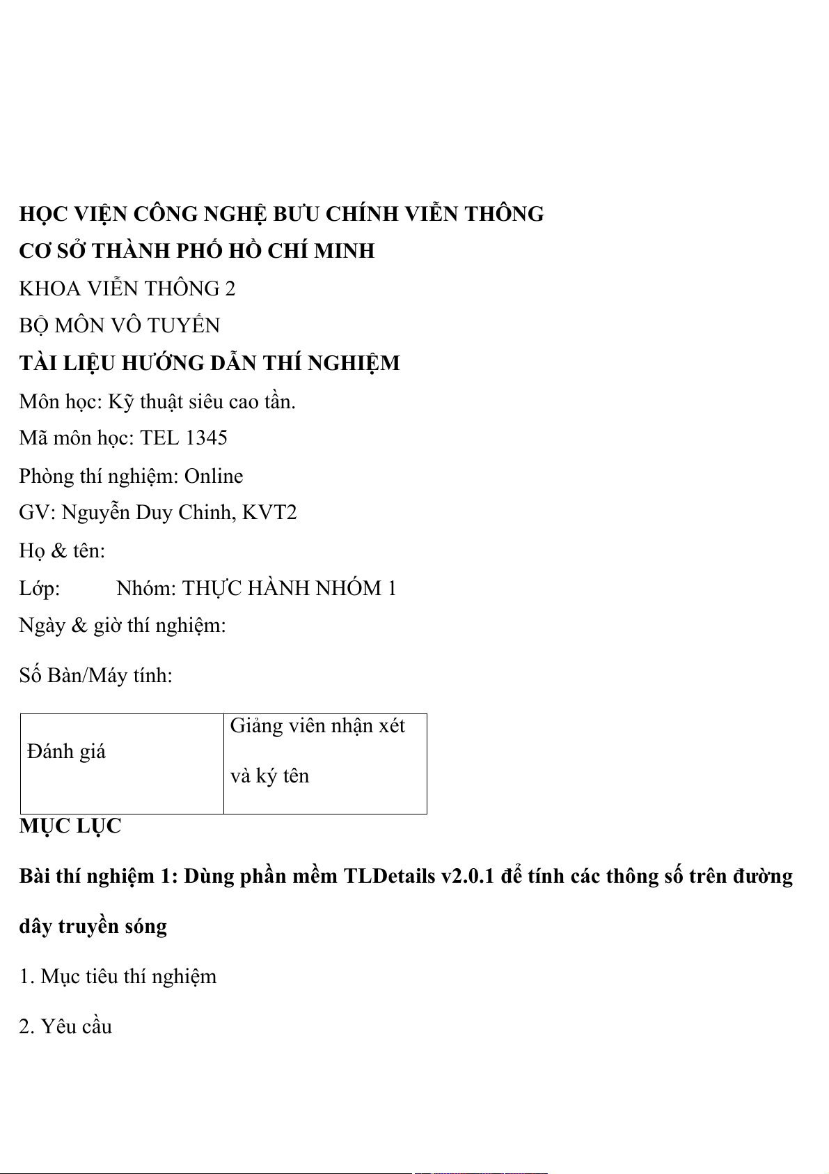 Môn học: Kỹ thuật siêu cao tần. Mã môn học: TEL 1345 Phòng thí nghiệm: Online GV: Nguyễn Duy Chinh, KVT2 Họ & tên: Lớp: Nhóm: THỰC HÀNH NHÓM 1