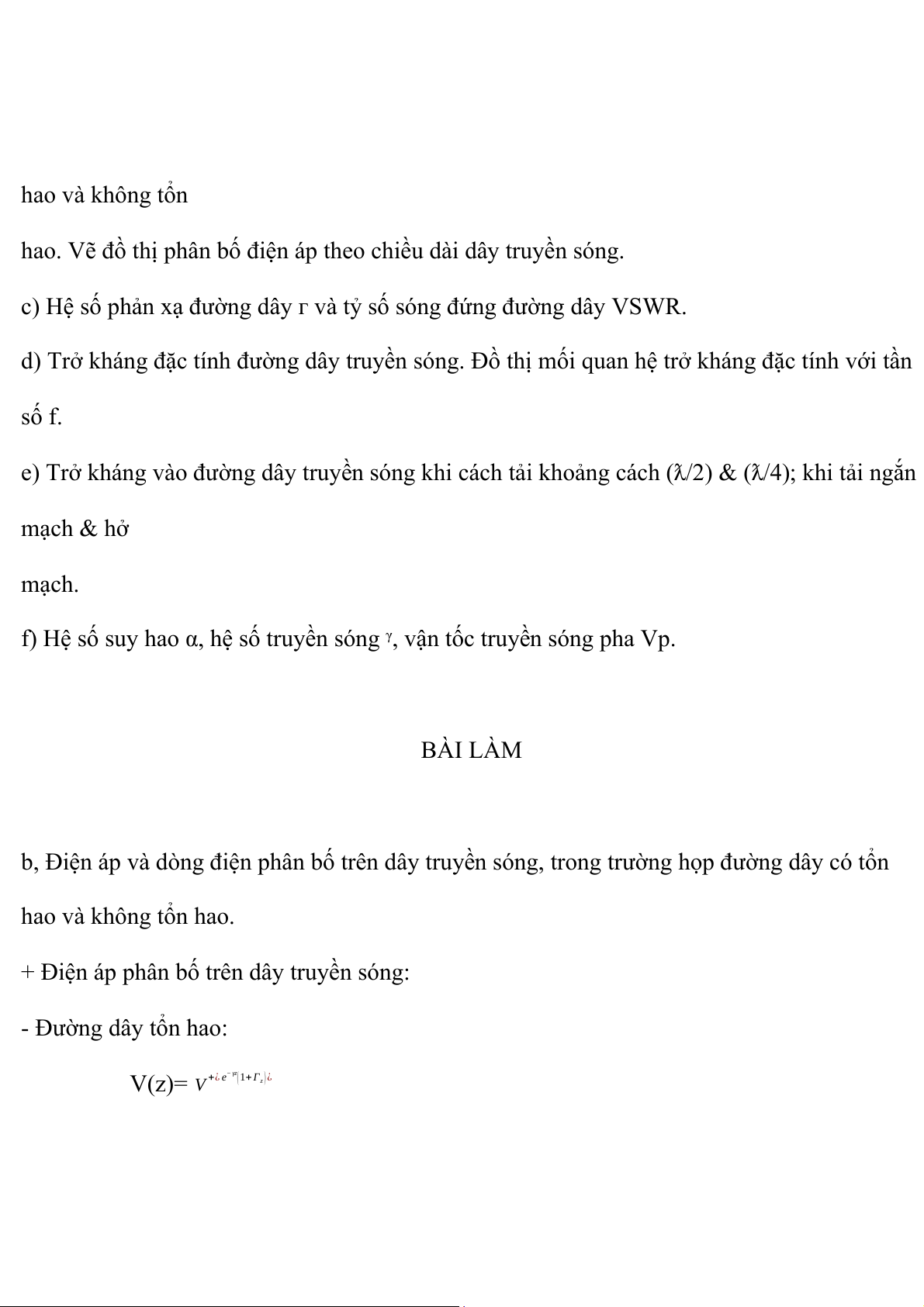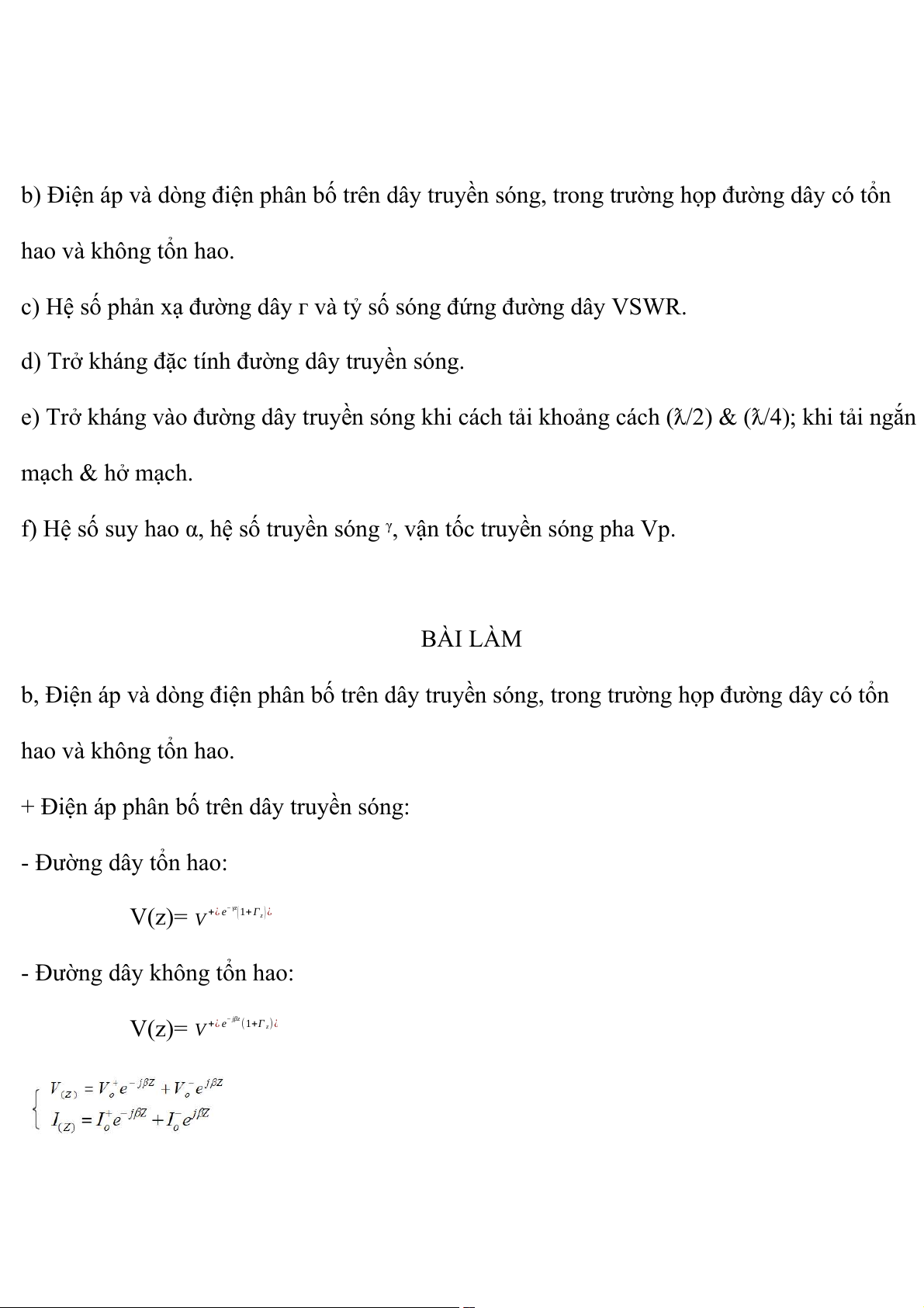 f) Hệ số suy hao α, hệ số truyền sóng ᵞ, vận tốc truyền sóng pha Vp. BÀI LÀM