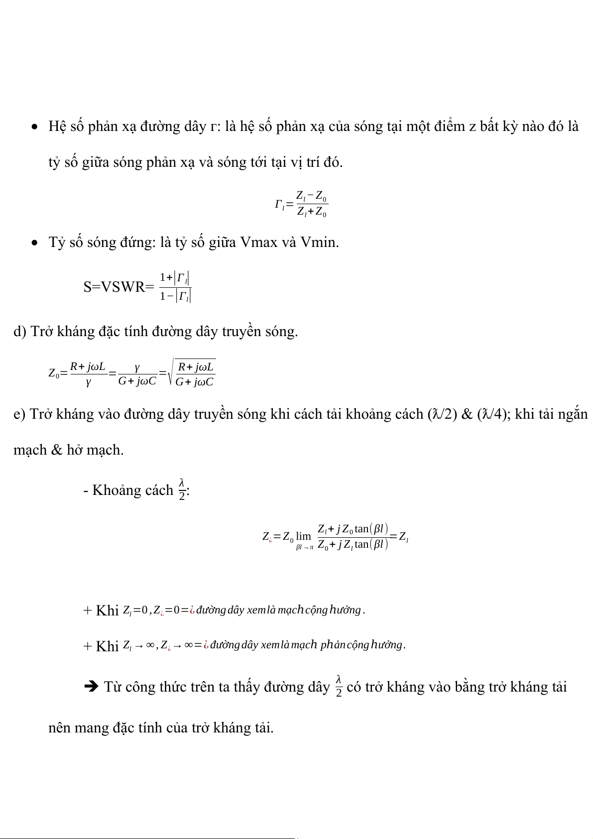 e) Trở kháng vào đường dây truyền sóng khi cách tải khoảng cách (ƛ/2) & (ƛ/4); khi tải ngắn mạch & hở mạch. - Khoảng cách λ : 2