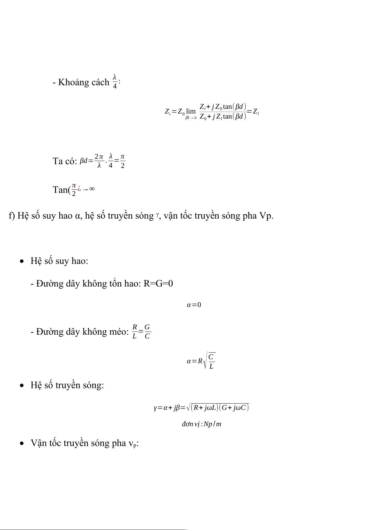f) Hệ số suy hao α, hệ số truyền sóng ᵞ, vận tốc truyền sóng pha Vp. Hệ số suy hao: