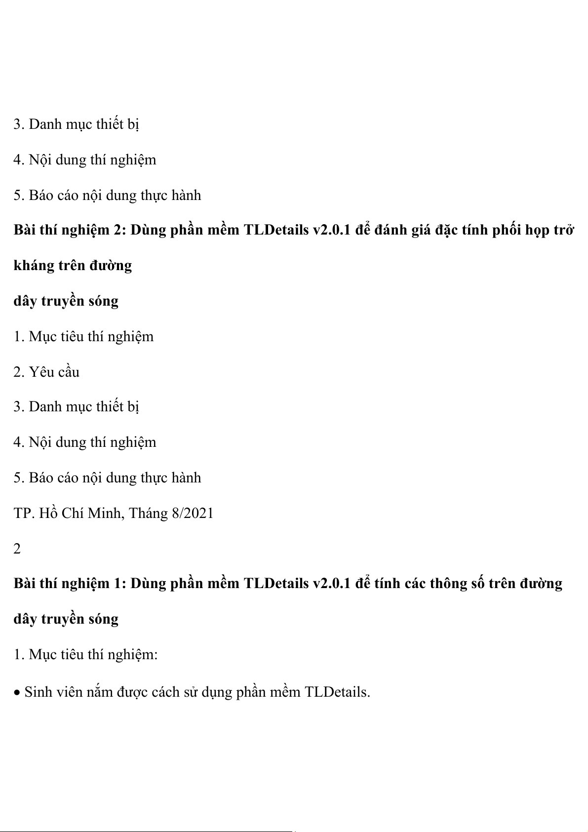 Bài thí nghiệm 2: Dùng phần mềm TLDetails v2.0.1 để đánh giá đặc tính phối họp trở kháng trên đường dây truyền sóng 1. Mục tiêu thí nghiệm 2. Yêu cầu 3. Danh mục thiết bị 4. Nội dung thí nghiệm