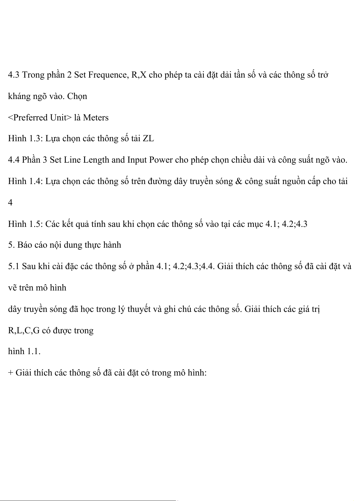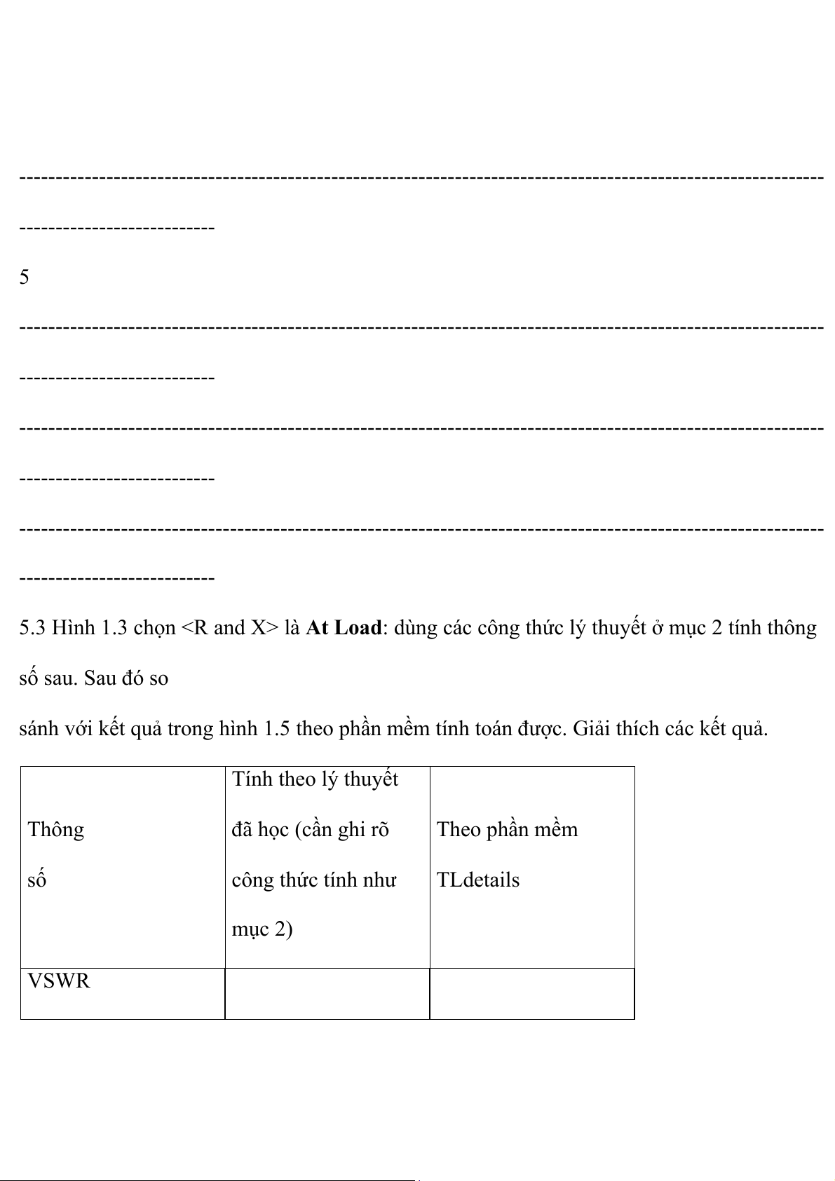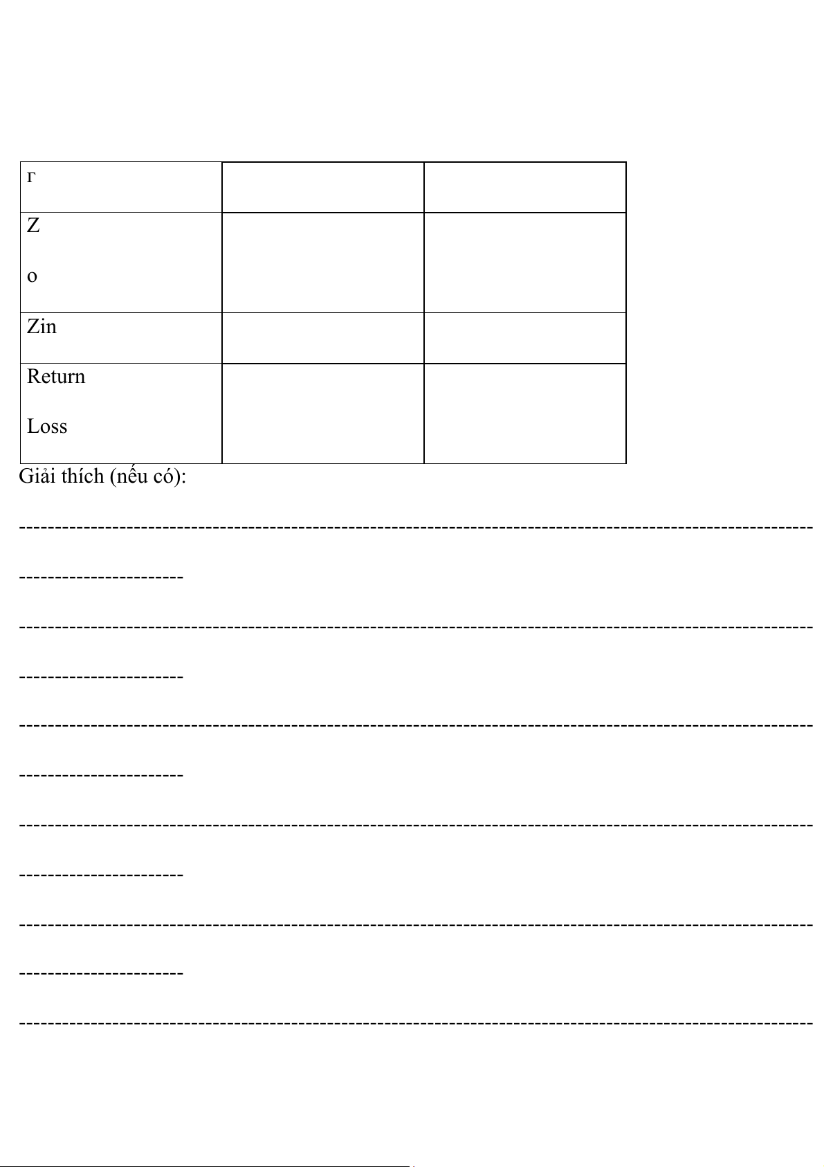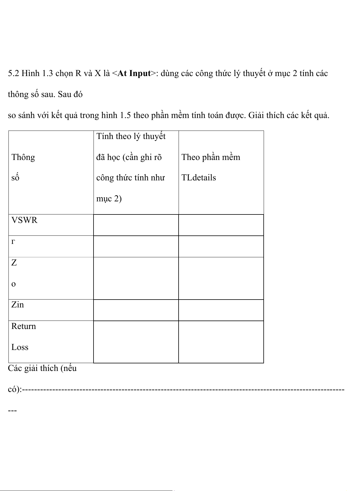 so sánh với kết quả trong hình 1.5 theo phần mềm tính toán được. Giải thích các kết quả. Tính theo lý thuyết Thông đã học (cần ghi rõ Theo phần mềm số công thức tính như TLdetails mục 2) VSWR г Z o Zin Return Loss Các giải thích (nếu