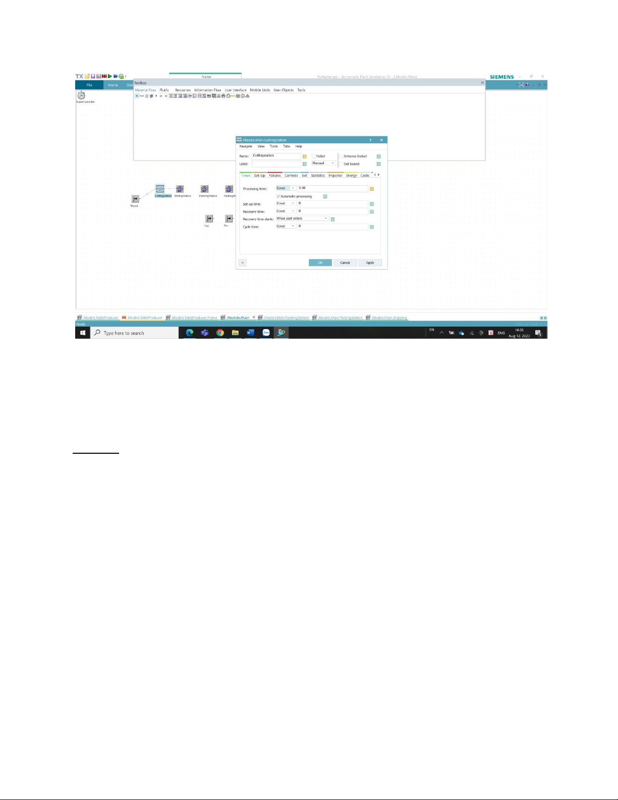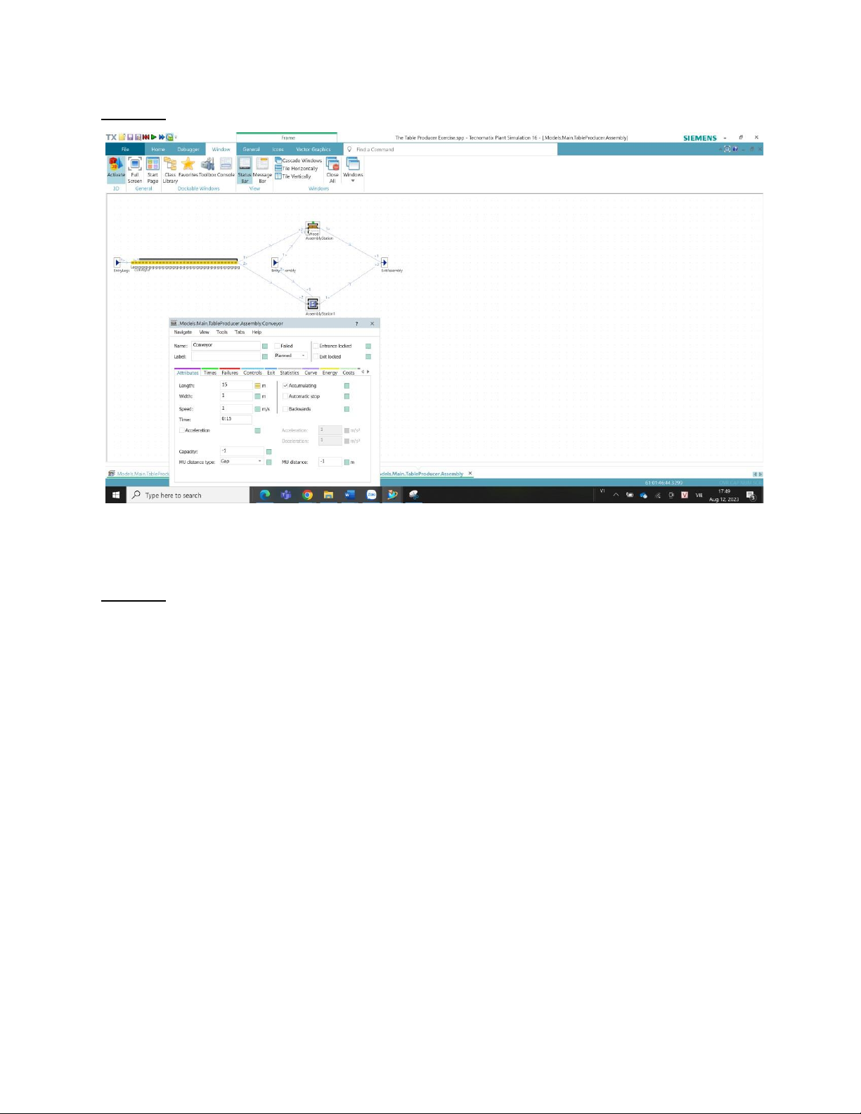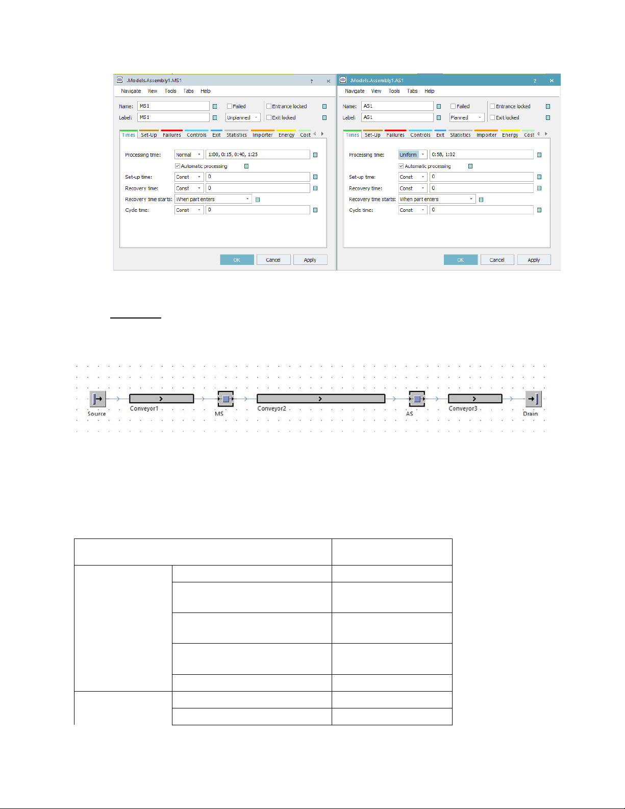 Thời gian bắt đầu cấp 6:00 AM MU Thời gian kết thúc cấp 7:00 AM MU Loại MU Container Container Chiều dài 0.5 m Chiều rộng 0.3 m Chiều cao 0.2 m Conveyor1 Chiều dài 6 m Chiều rộng 0.8 m Tốc độ 0.2 m/s MS Thời gian xử lý 30s/sản phẩm Thời gian set up 2 phút 30s Conveyor2 Chiều dài 12 m Chiều rộng 0.8 m Tốc độ 0.25 m/s AS Thời gian xử lý 20s/sản phẩm Thời gian set up 1 phút 30 s Conveyor3 Chiều dài 5 m Chiều rộng 0.8 m Chiều cao 0.1 m/s Drain Thời gian xử lý 10s Thời gian set up 1 phút