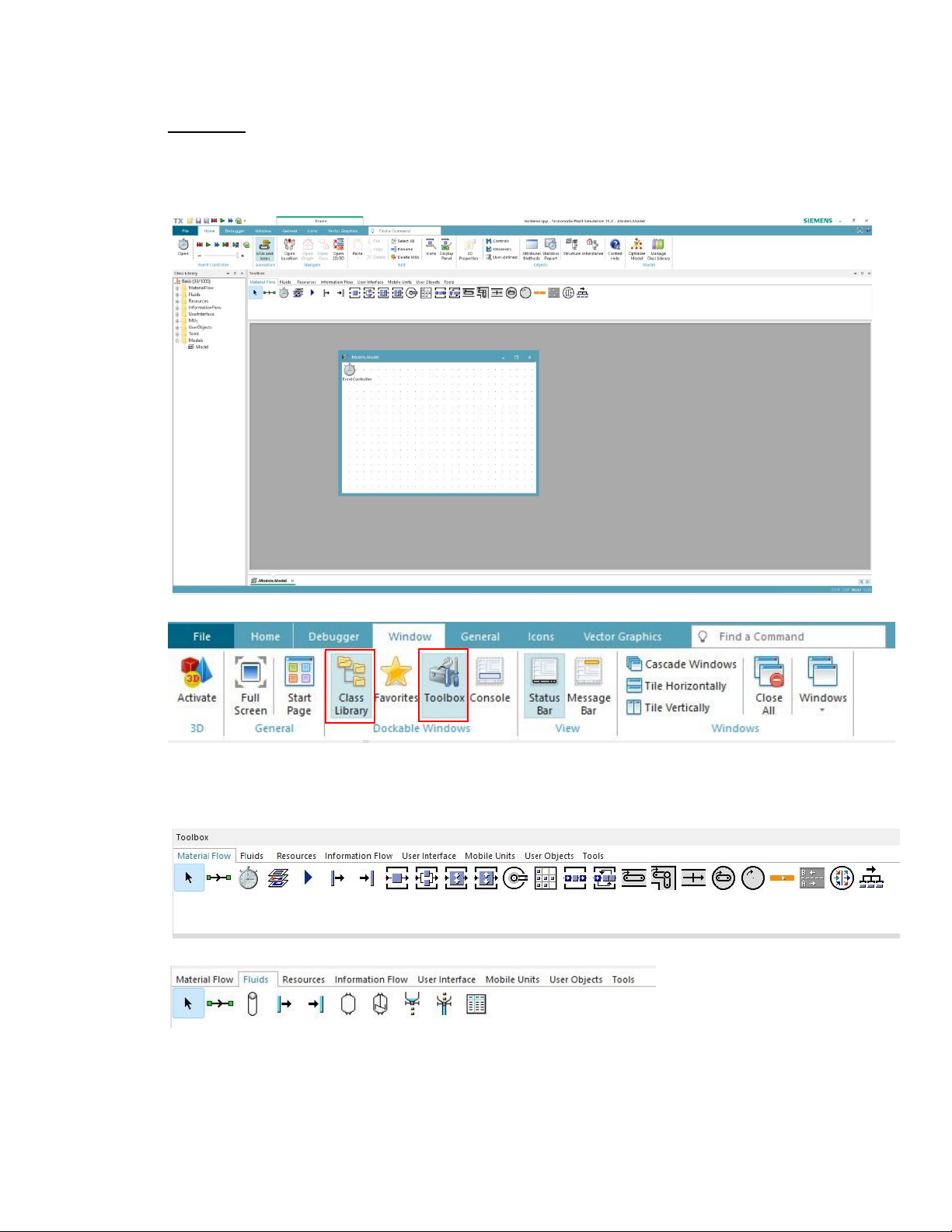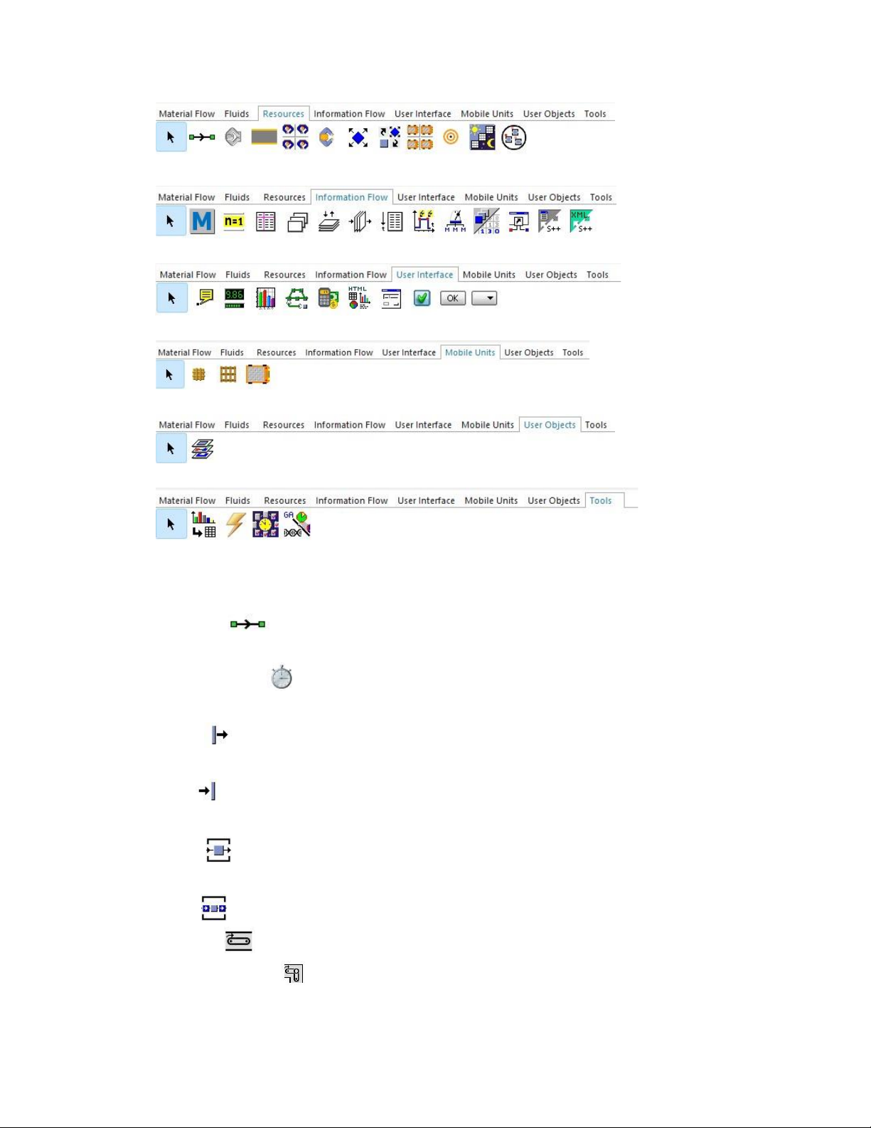 Thanh Toolbox sau khi đã mở sẽ cung cấp tất cả những thành phần cần thiết để xây dựng mô hình: • Material Flow • Fluids • Resources • Information Flow • User Interface • Mobile Units • User Objects • Tools