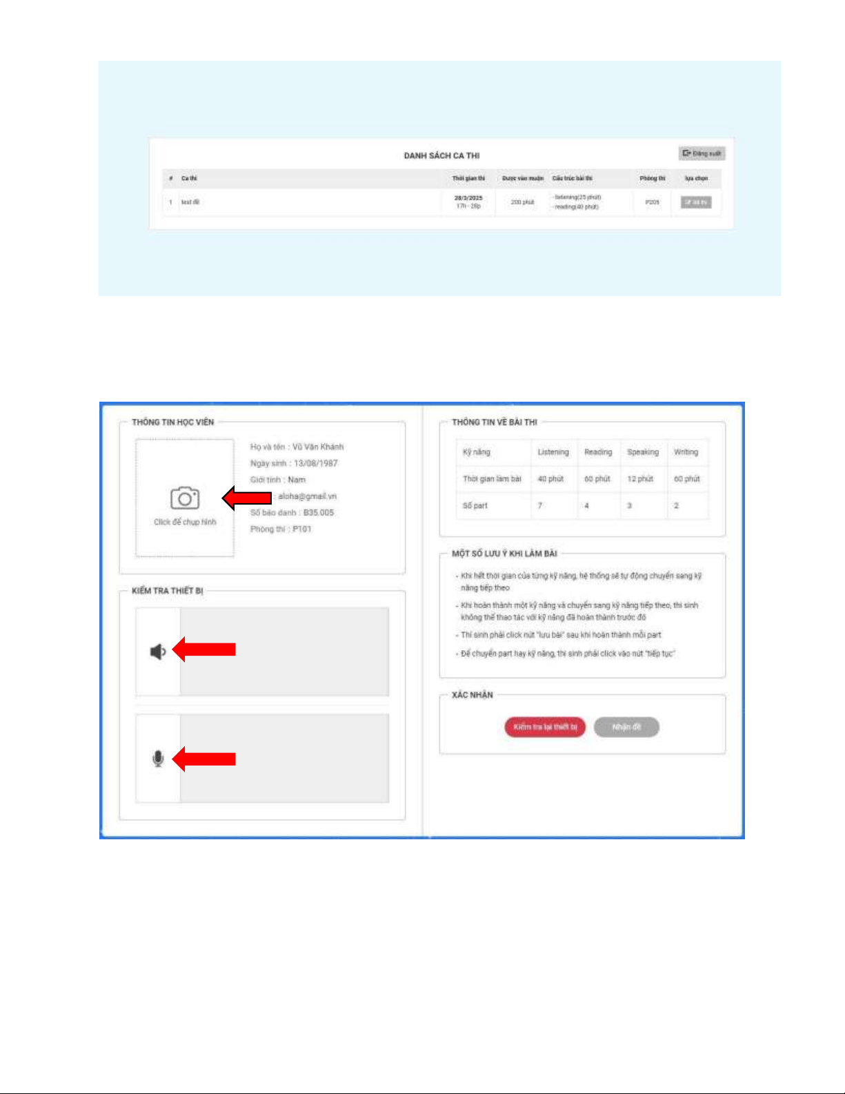 Sau khi kich hoạt chế độ kiểm tra micro, nếu thí sinh nghe thấy âm thanh thu từ Mic trong
