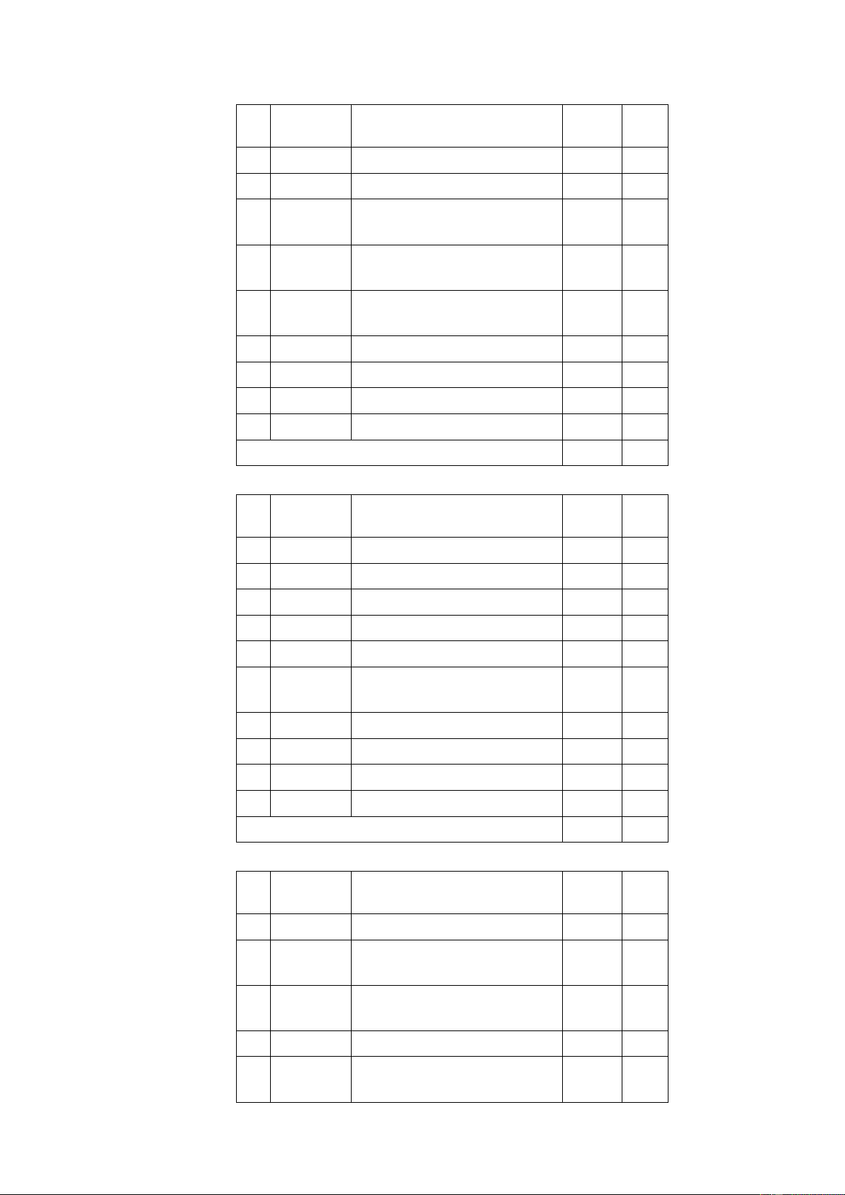 QGTC2 Giáo dục thể chất 2 1 30 8 LLLM3 Kỹ năng mềm 2 40 Tổng cộng 18 348 1.7.3. Học kỳ 3 Mã học Số tín TT Số tiết phần Tên học phần chỉ 1 CBLH2 Vật lý đại cương 2 3 50 Thực hành vật lý đại 2 CBLH3 cương 1 & 2 2 54 3 CBNN1 Tiếng Anh 1 3 58 4 CBTT4 Xác suất thống kê 2 34 5 CBTT5 Phương pháp tính 2 35 6 CTKT2 Mạng máy tính 3 54 7 LLTH1 Tư tưởng Hồ Chí Minh 2 40 8 QGTC3 Giáo dục thể chất 3 1 30 Tổng cộng 18 355 1.7.4. Học kỳ 4 Mã học Số tín Số TT Tên học phần phần chỉ tiết 1 CBNN2 Tiếng Anh 2 3 58 2 CBTT6 Toán rời rạc 2 35 3 CTKT3