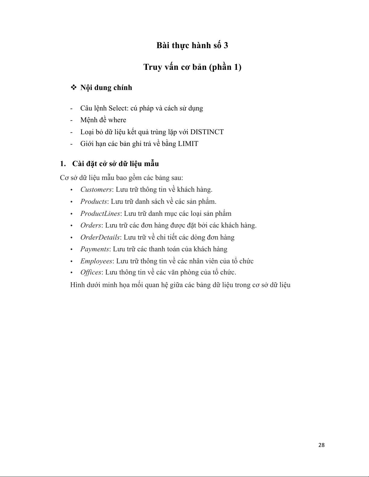 Cơ sở dữ liệu mẫu bao gồm các bảng sau: •