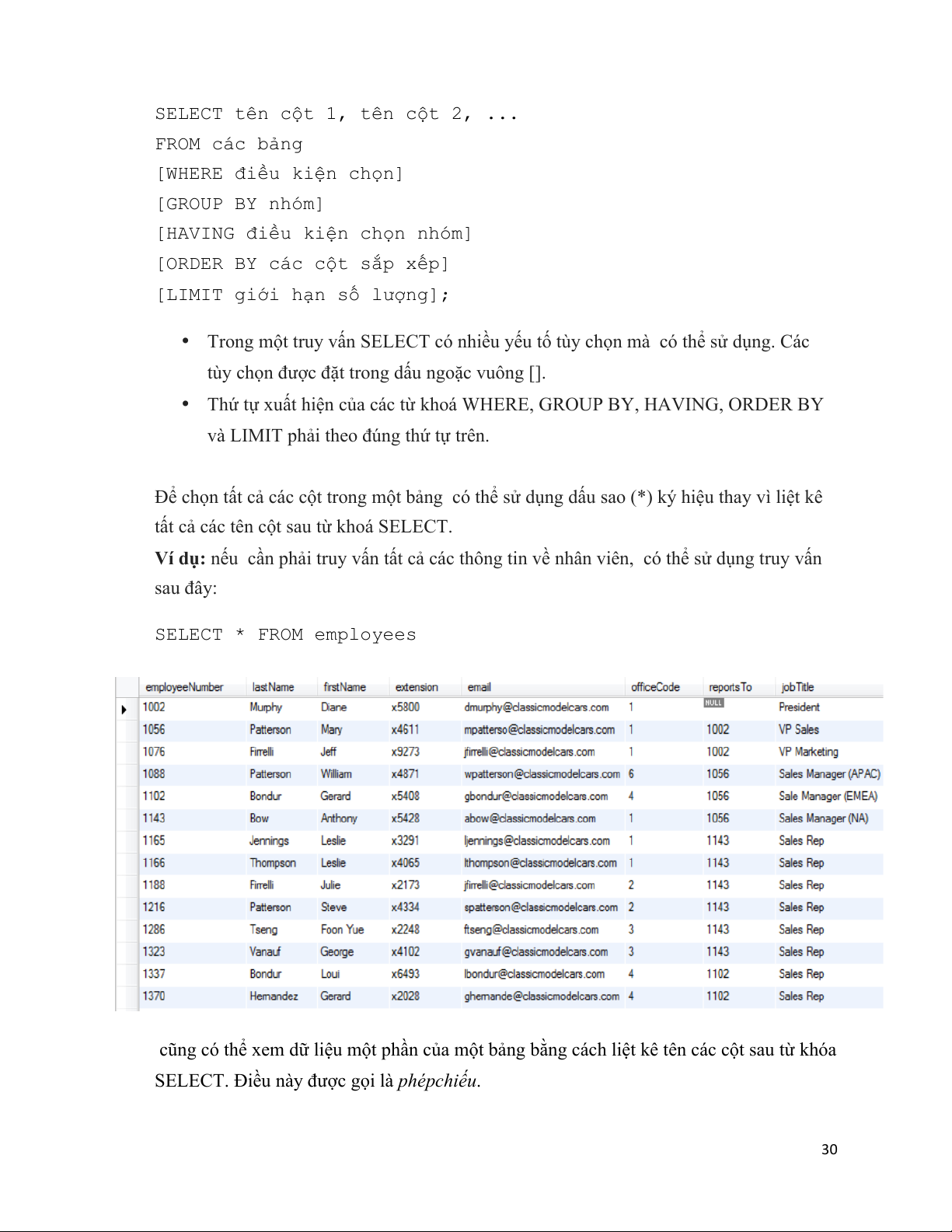Ví dụ: nếu cần phải truy vấn tất cả các thông tin về nhân viên, có thể sử dụng truy vấn sau đây: SELECT * FROM employees