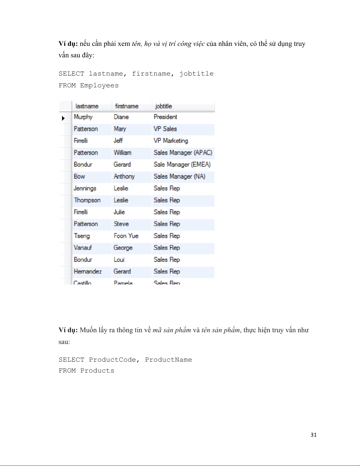 Ví dụ: nếu cần phải xem tên, họ và vị trí công việc của nhân viên, có thể sử dụng truy vấn sau đây: