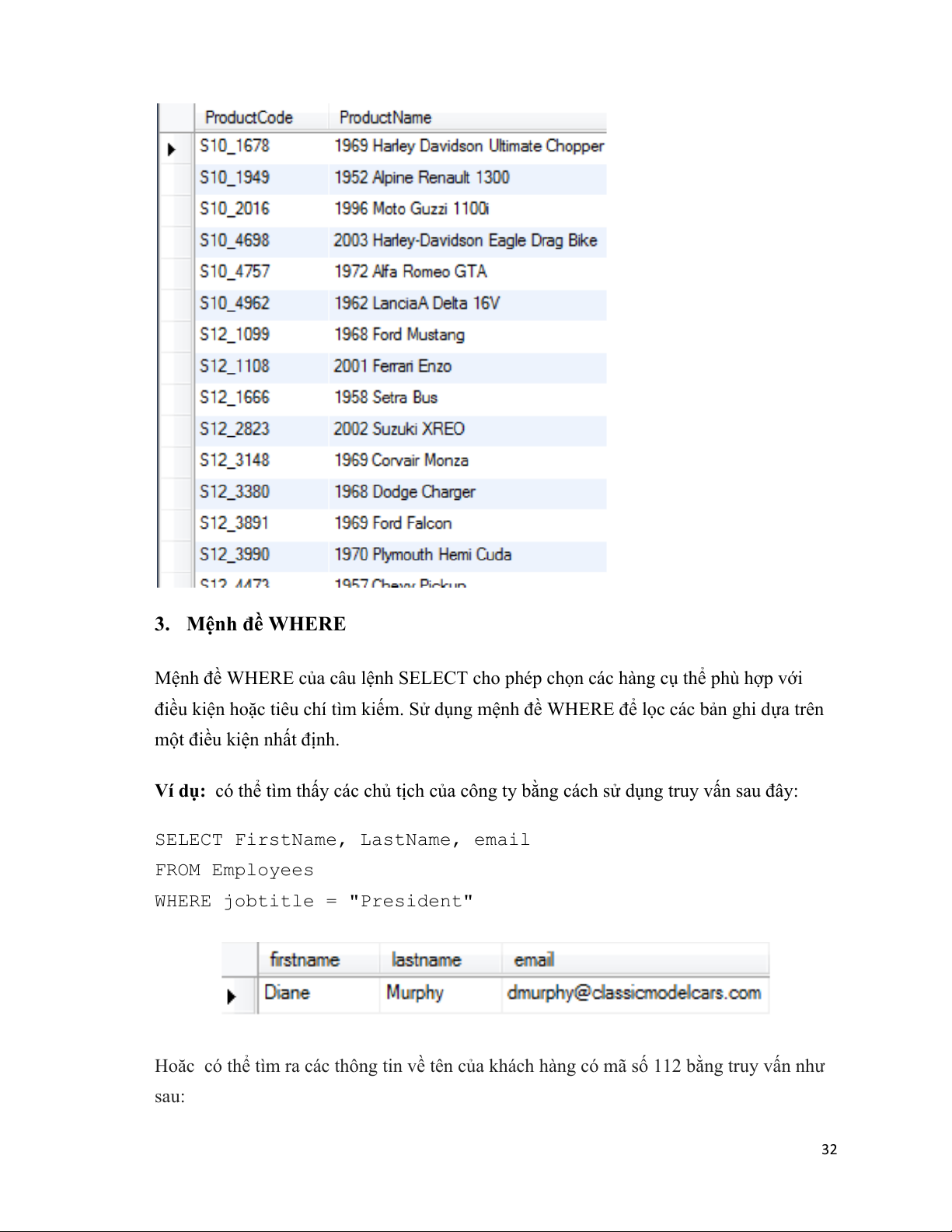 SELECT ProductCode, ProductName FROM Products 31# # 3. Mệnh đề WHERE