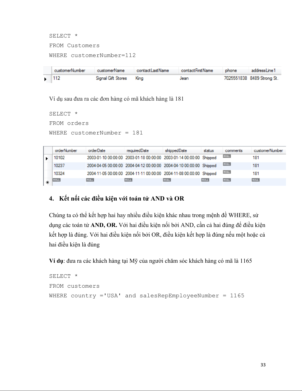 Hoăc có thể tìm ra các thông tin về tên của khách hàng có mã số 112 bằng truy vấn như sau: 32# # SELECT * FROM Customers WHERE customerNumber=112