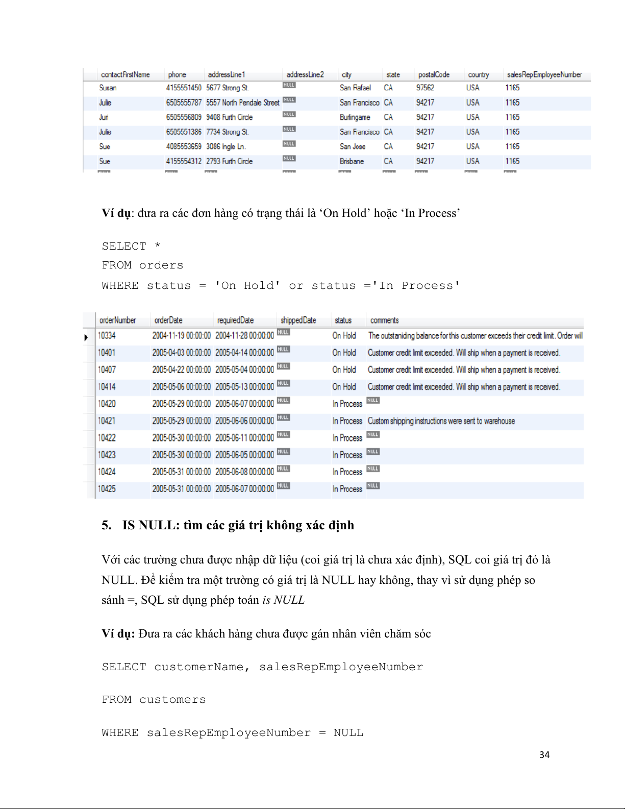 Ví dụ: đưa ra các đơn hàng có trạng thái là ‘On Hold’ hoặc ‘In Process’ SELECT * FROM orders