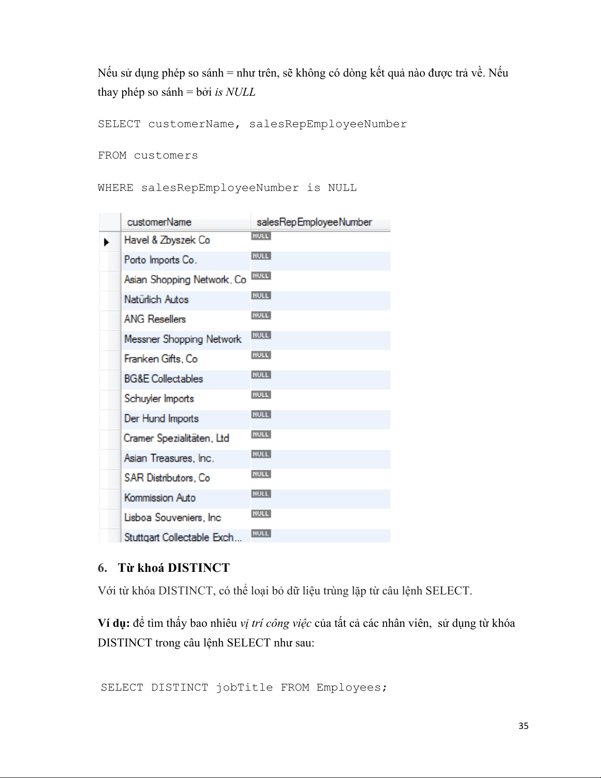 WHERE salesRepEmployeeNumber is NULL 6. Từ khoá DISTINCT