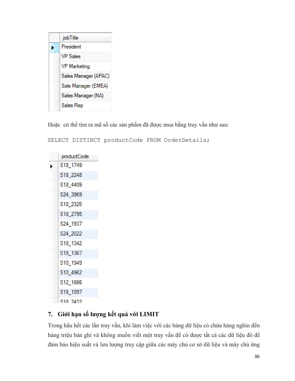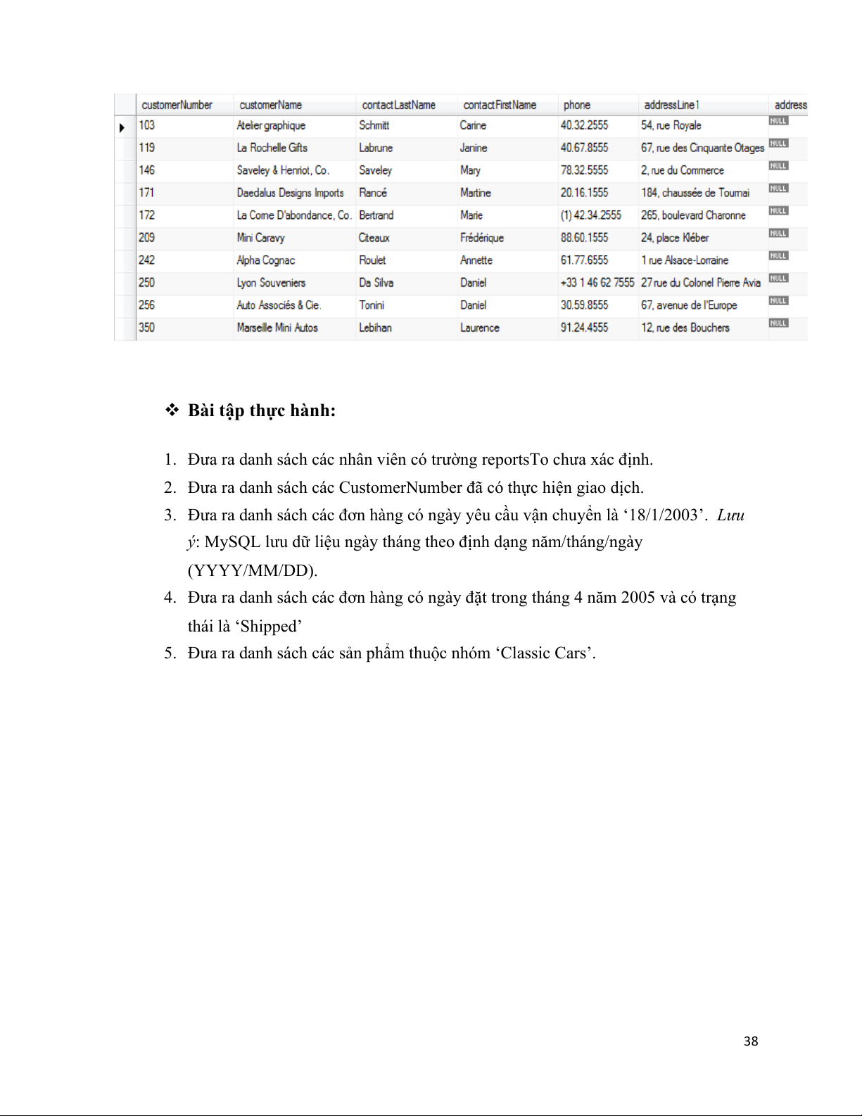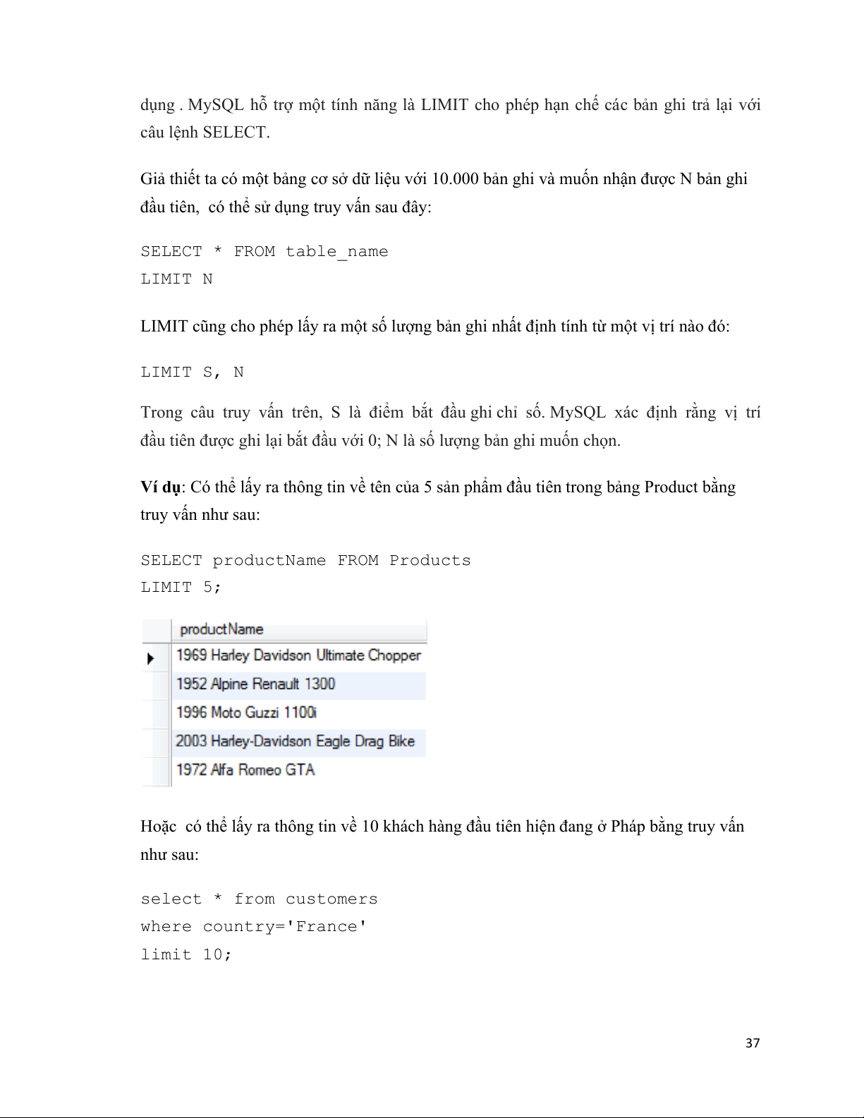 Hoặc có thể lấy ra thông tin về 10 khách hàng đầu tiên hiện đang ở Pháp bằng truy vấn như sau: select * from customers where country='France' limit 10; 37# #