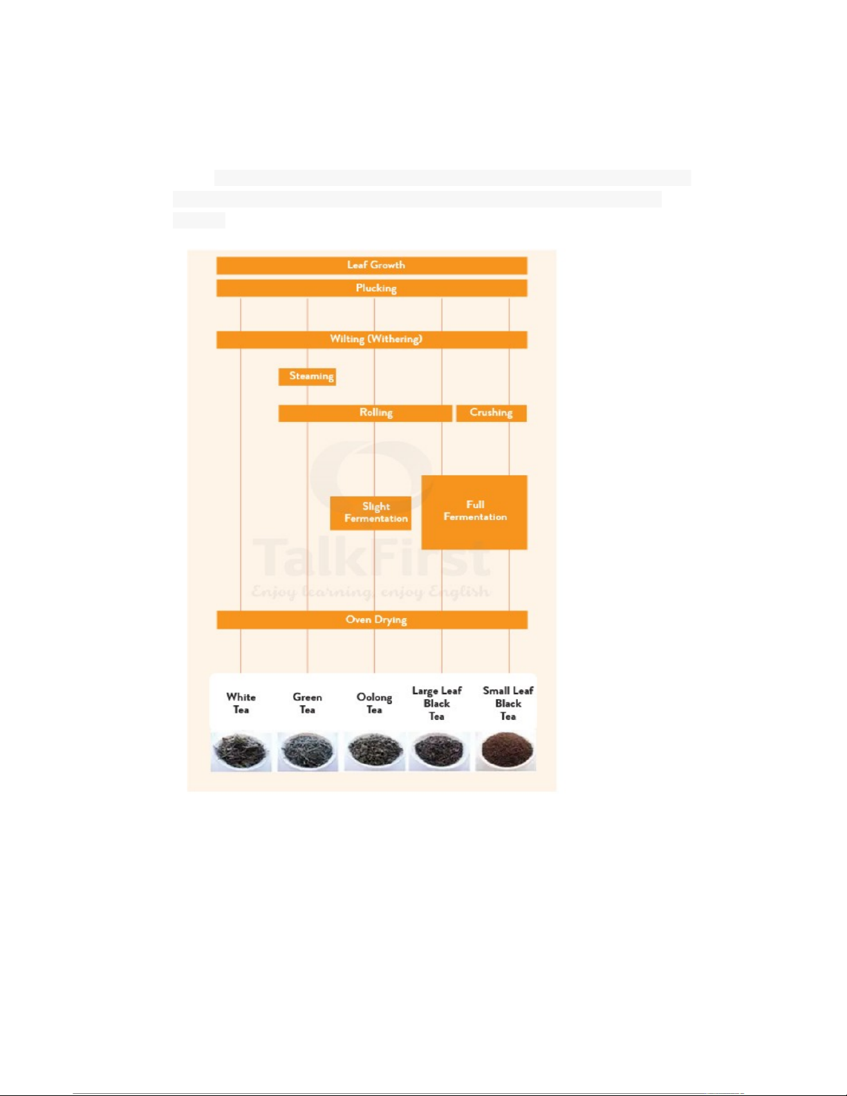 Đề thi: The diagram shows how tea leaves are processed into five tea types. Summarize the