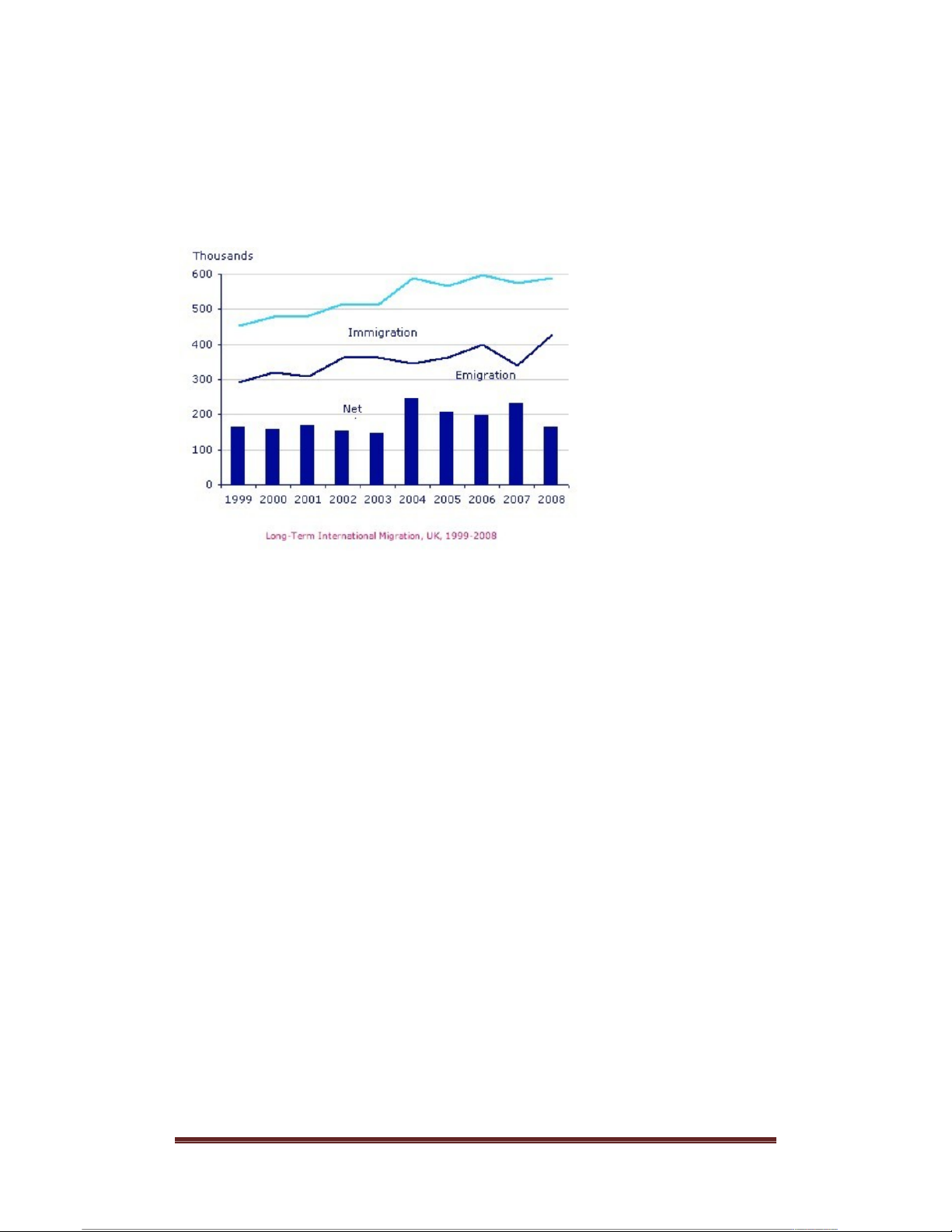 The chart gives information about UK immigration, emigration and net migration between 1999 and 2008.