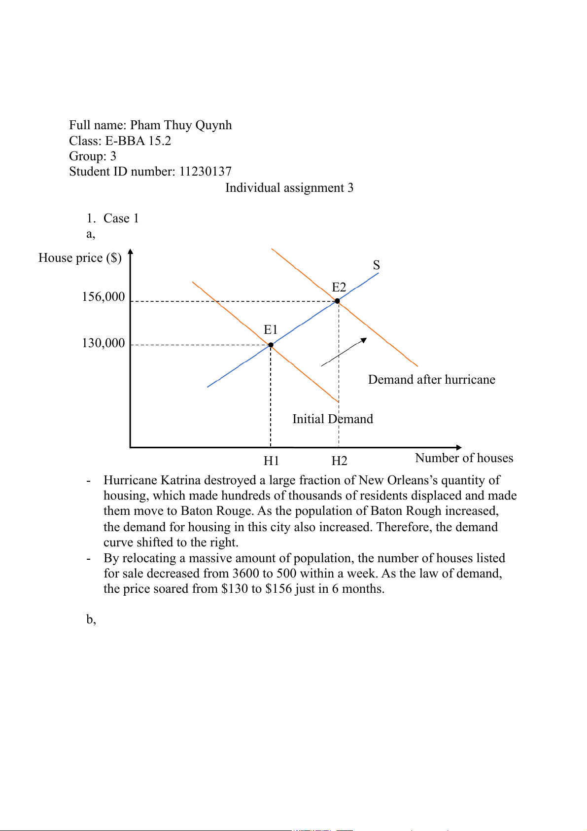 Full name: Pham Thuy Quynh Class: E-BBA 15.2 Group: 3 Student ID number: 11230137 Individual assignment 3 1. Case 1 a, House price ($) S E2 156,000 E1 130,000 Demand after hurricane Initial Demand H1 H2 Number of houses