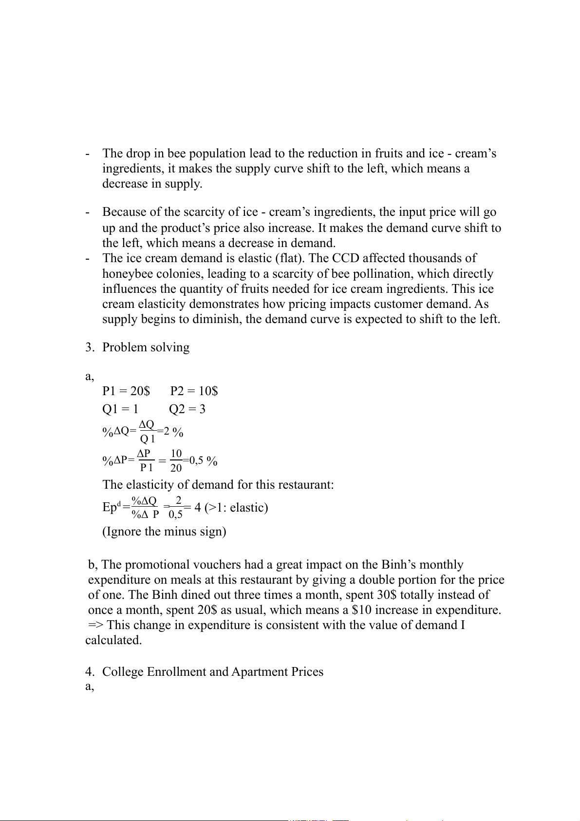 supply begins to diminish, the demand curve is expected to shift to the left. 3. Problem solving a, P1 = 20$ P2 = 10$ Q1 = 1 Q2 = 3 ΔQ %ΔQ= =2 % Q 1 ΔP %ΔP= = 10=0,5 % P 1 20