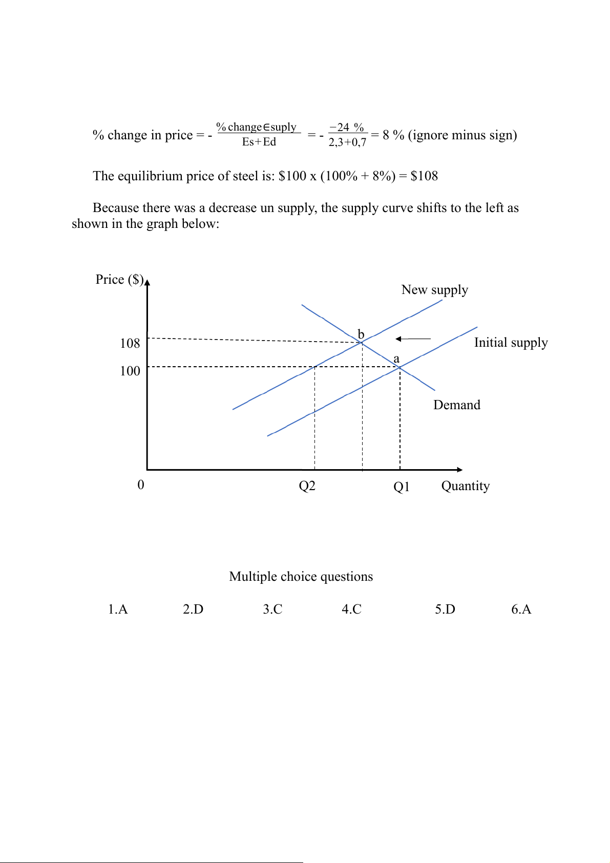 Because there was a decrease un supply, the supply curve shifts to the left as shown in the graph below: Price ($) New supply b 108 Initial supply a 100 Demand 0 Q2 Q1 Quantity Multiple choice questions 1.A 2.D 3.C 4.C 5.D 6.A