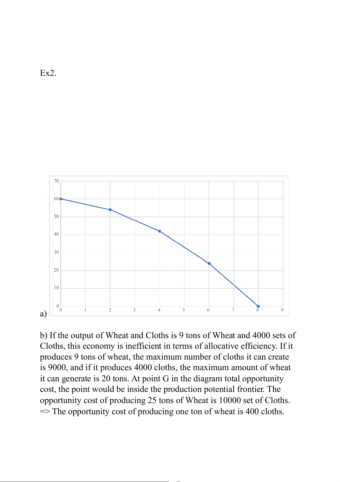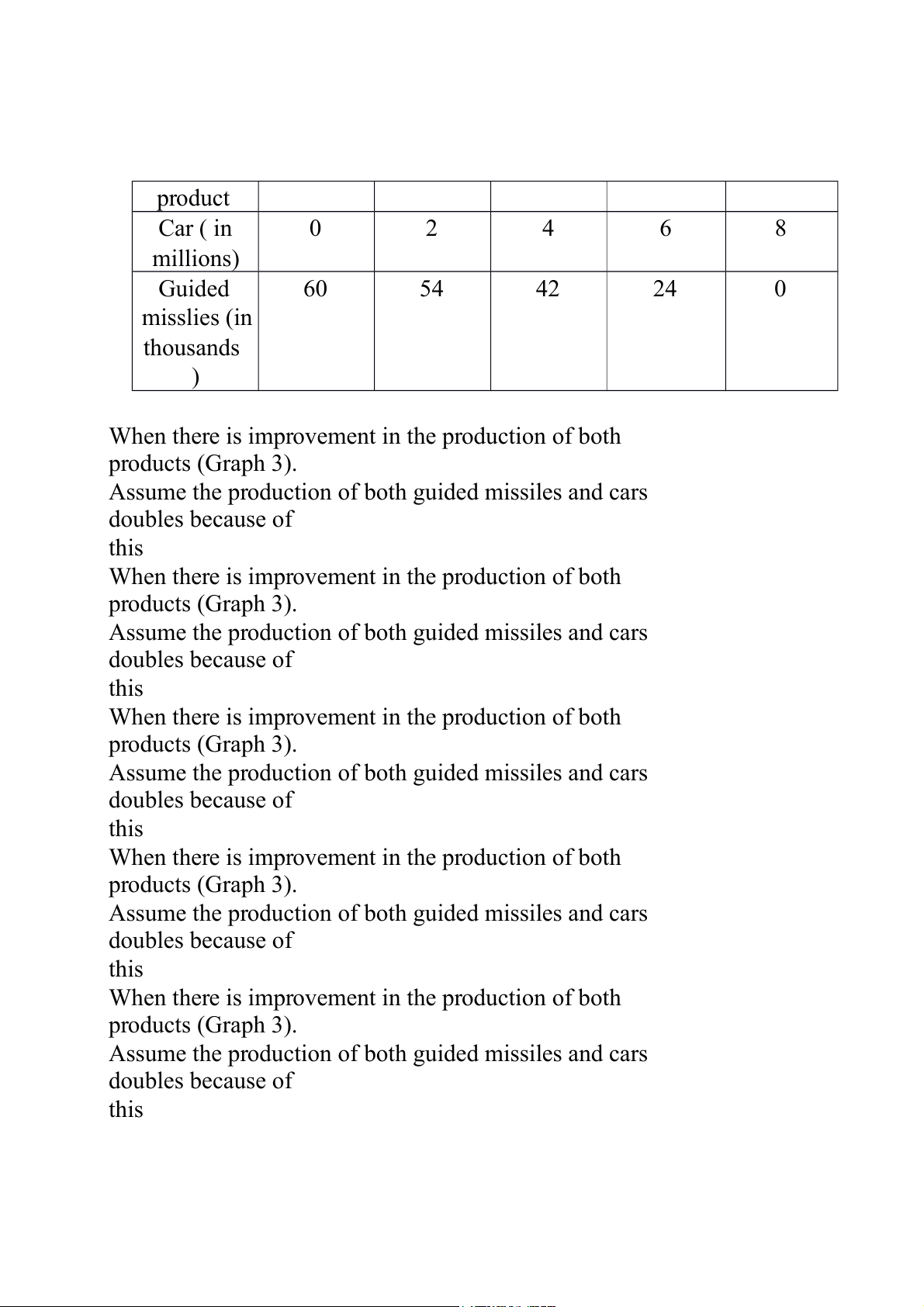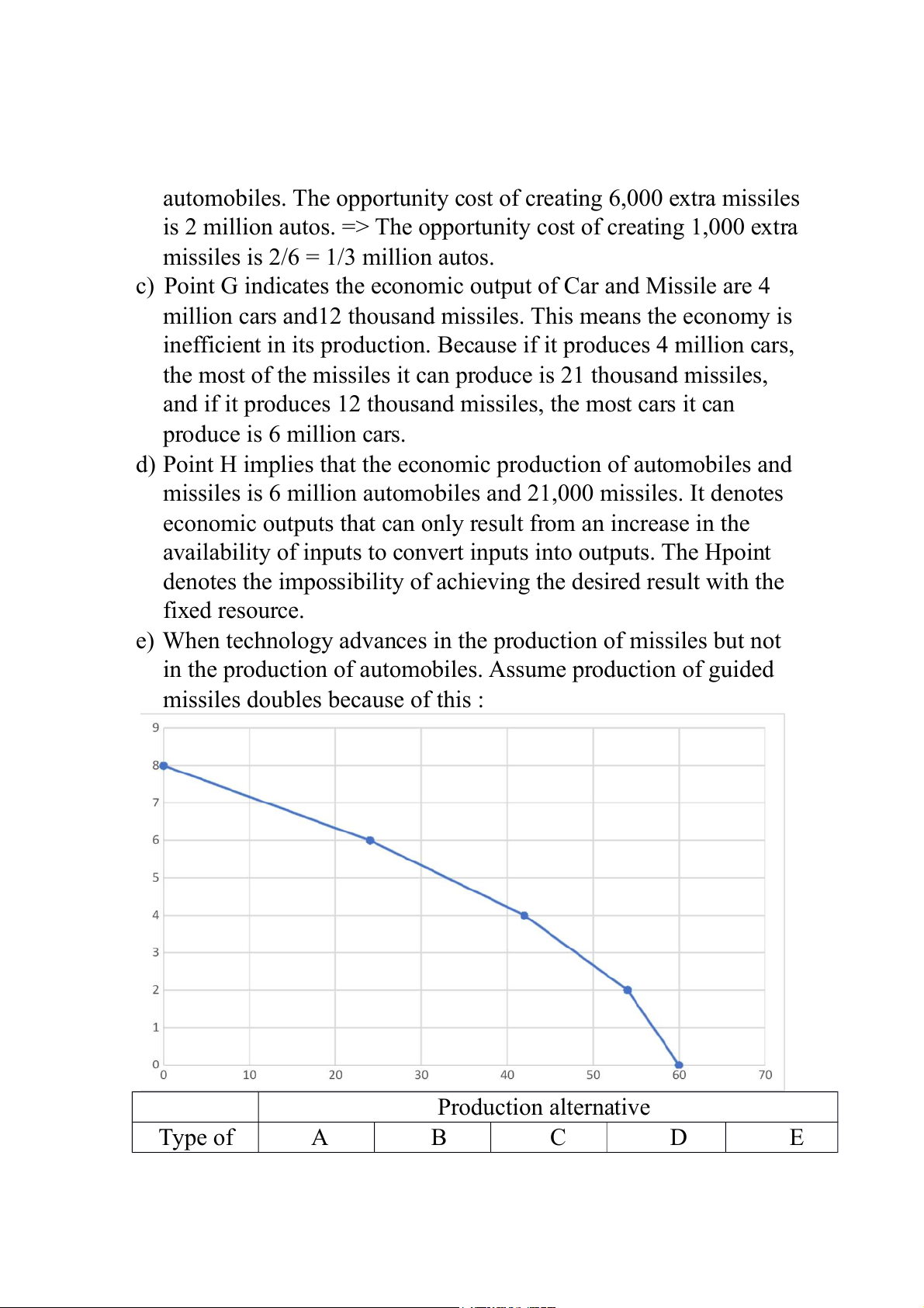 Assume the production of both guided missiles and cars doubles because o Production alternative Type of A B C D E product Car ( in 0 4 8 12 16 millions) Guided 60 54 42 24 0 misslies (in thousands ) Ex2. 70 60 50 40 30 20 10 0 a) 0 1 2 3 4 5 6 7 8 9