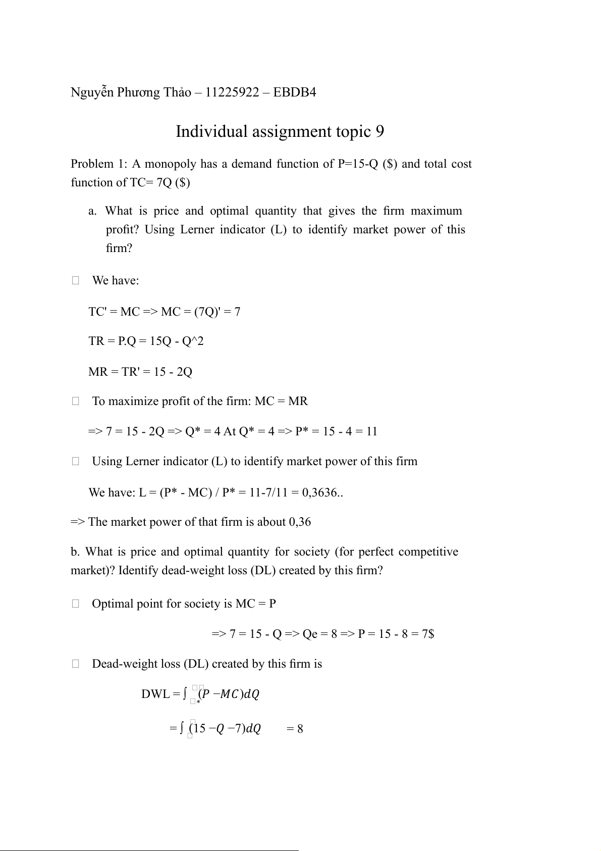 profit? Using Lerner indicator (L) to identify market power of this firm? We have: TC' = MC => MC = (7Q)' = 7 TR = P.Q = 15Q - Q^2 MR = TR' = 15 - 2Q