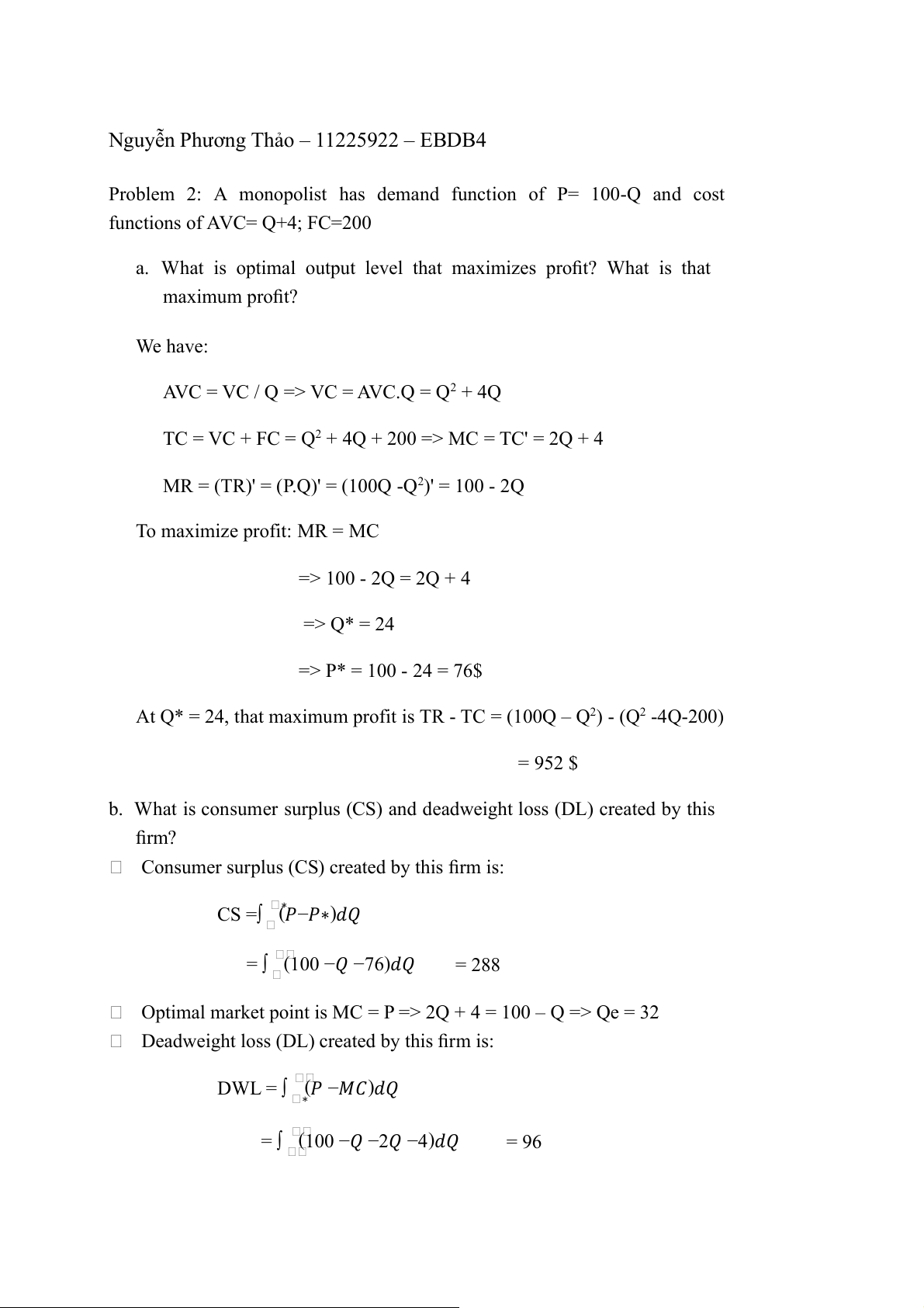 Problem 2: A monopolist has demand function of P= 100-Q and cost functions of AVC= Q+4; FC=200