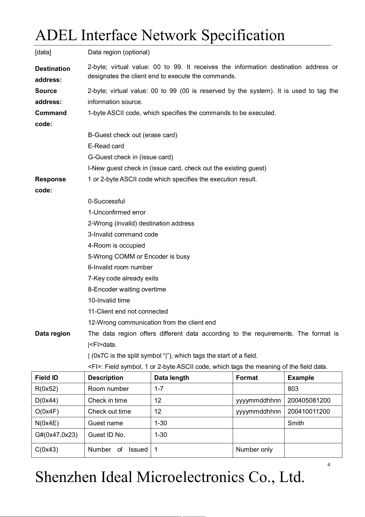 : Field symbol, 1 or 2-byte ASCII code, which tags the meaning of the field data. Field ID Description Data length Format Example R(0x52) Room number 1-7 803 D(0x44) Check in time 12 yyyymmddhhnn 200405081200 O(0x4F) Check out time 12 yyyymmddhhnn 200410011200 N(0x4E) Guest name 1-30 Smith G#(0x47,0x23) Guest ID No. 1-30 C(0x43) Number of Issued 1 Number only 4