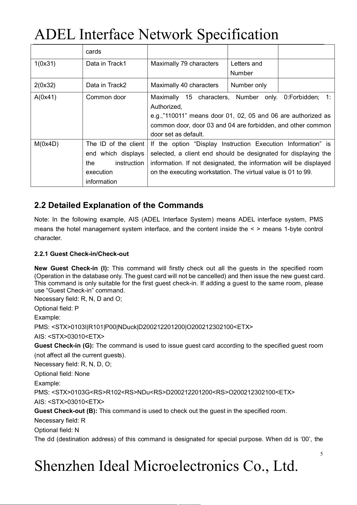ADEL Interface Network Specification cards 1(0x31) Data in Track1 Maximally 79 characters Letters and Number 2(0x32) Data in Track2 Maximally 40 characters Number only A(0x41) Common door